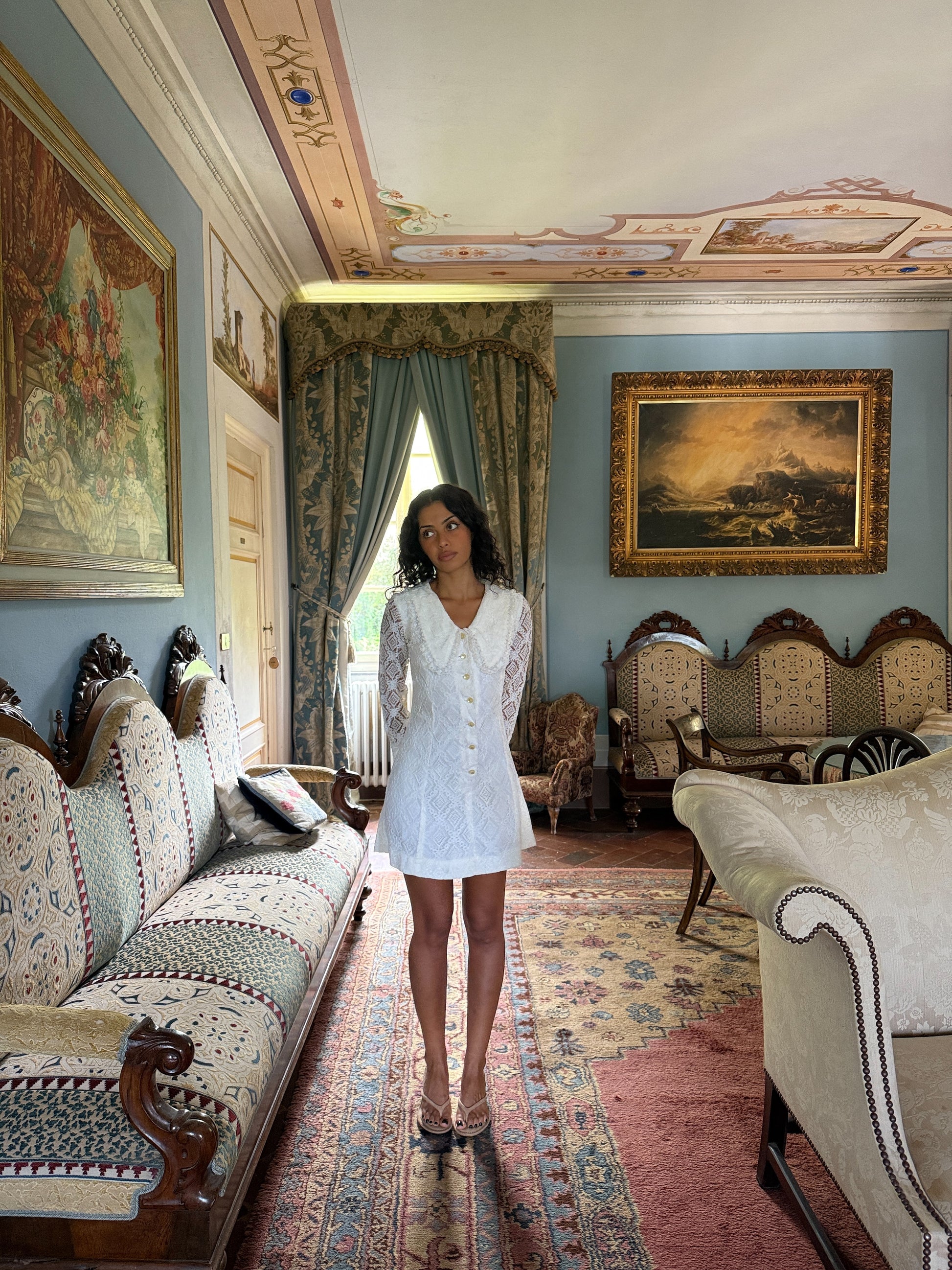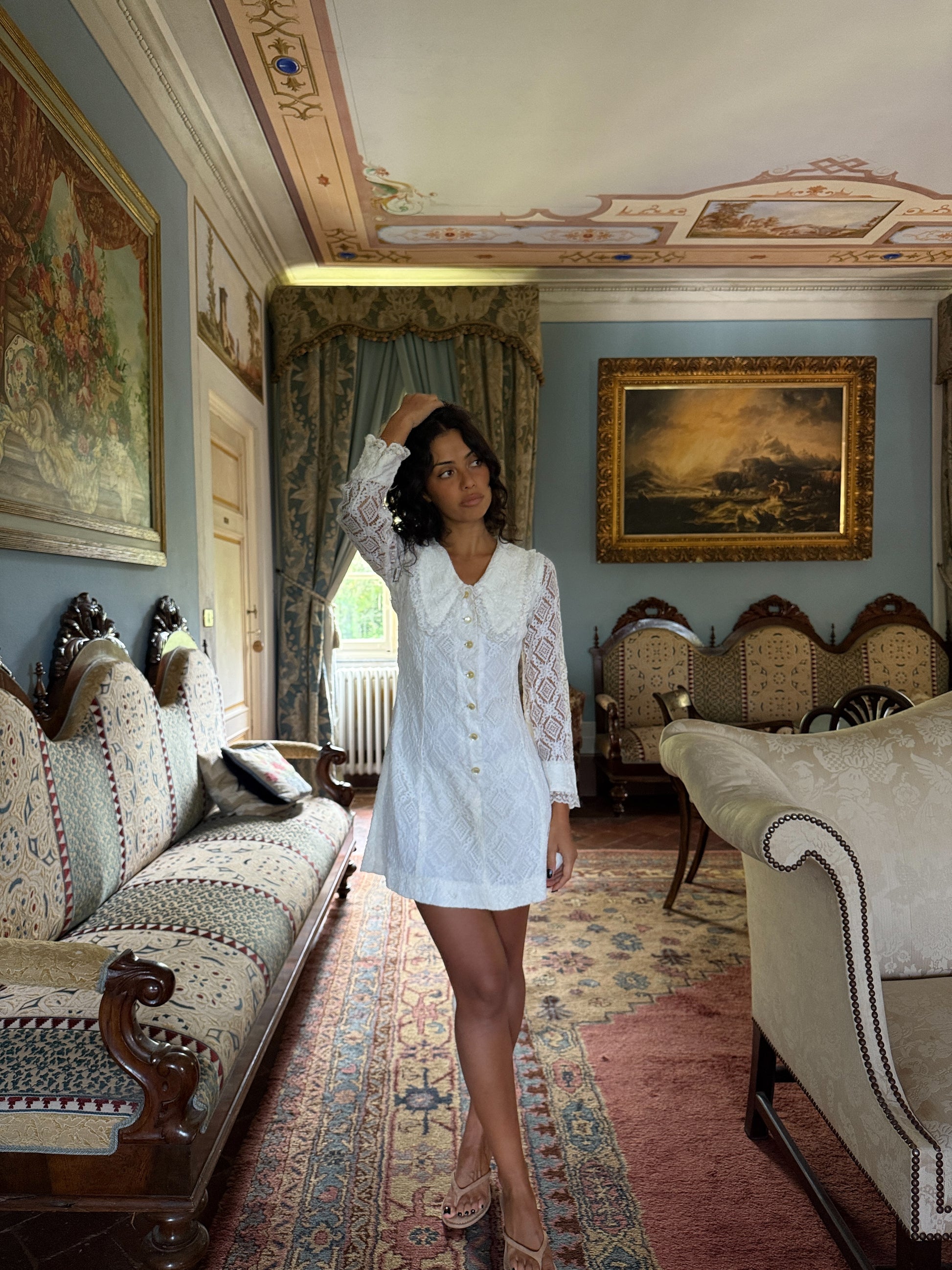 Step into timeless elegance with the Antoinette Lace Mini Dress — a romantic, vintage-inspired piece that exudes effortless femininity. Crafted in crisp white, this dress features delicate lace sleeves, a flattering A-line silhouette, and intricate textured embroidery throughout the body. The full front is adorned with subtle gold-toned buttons, adding a refined touch to its already graceful charm.