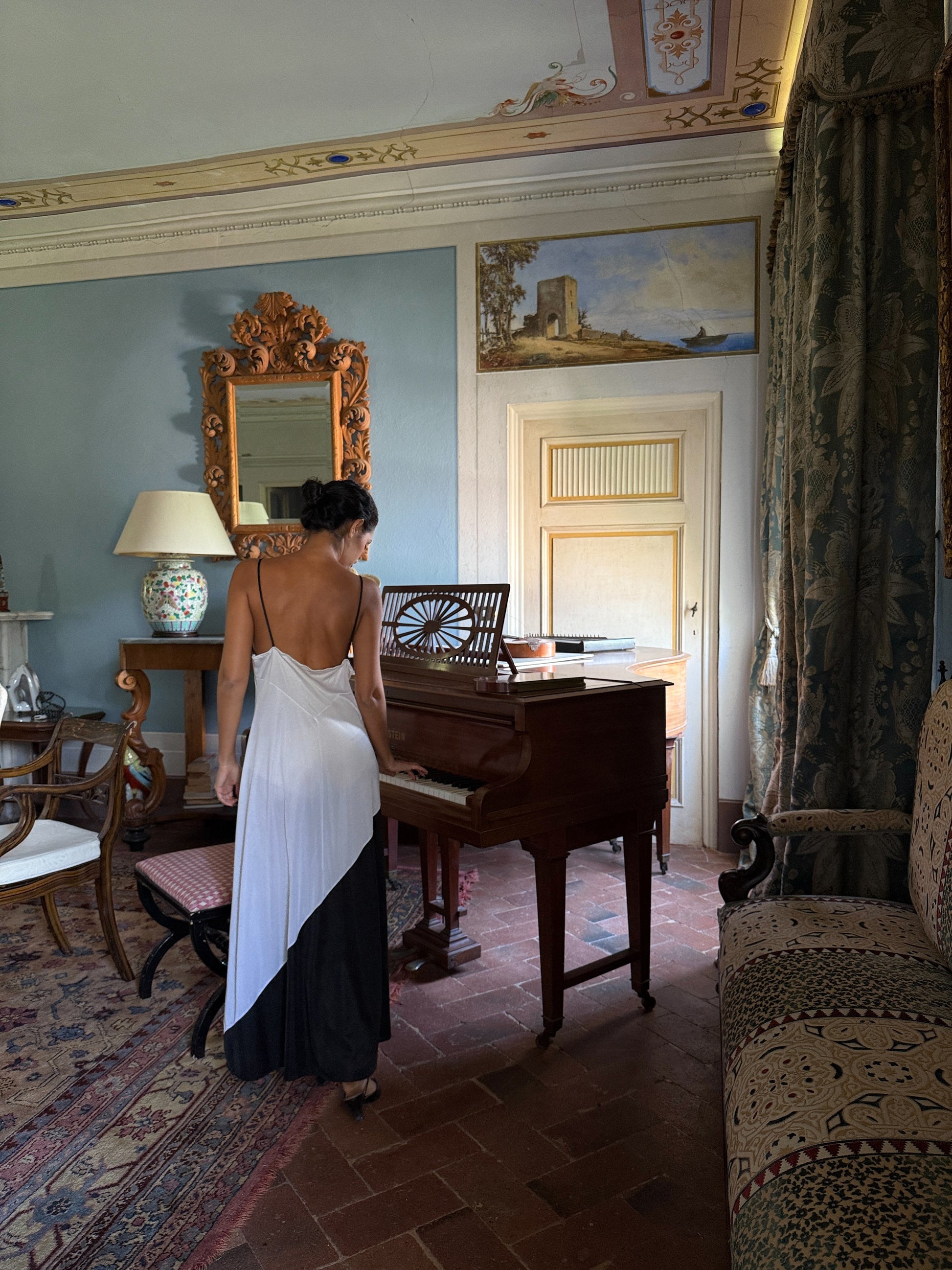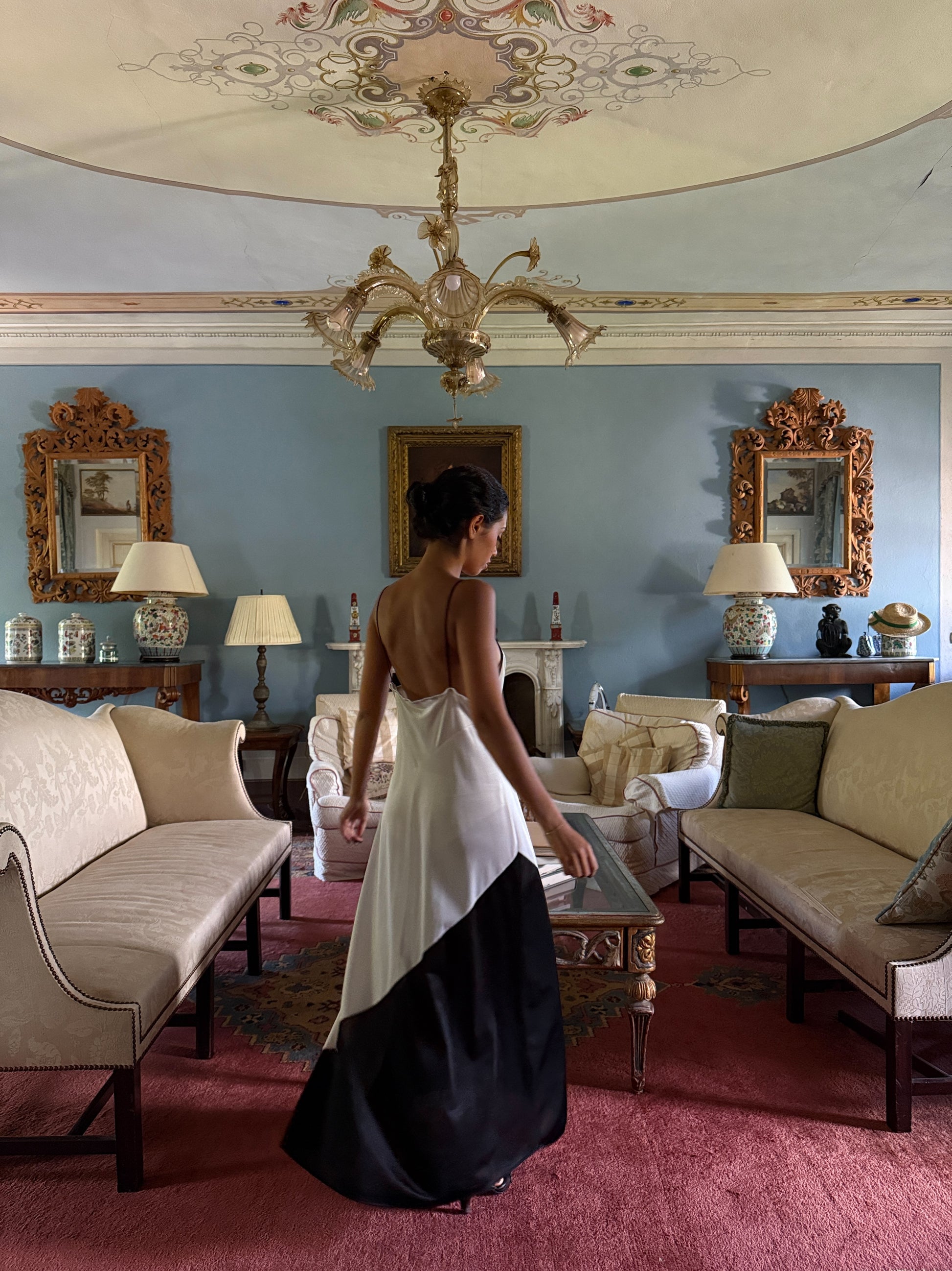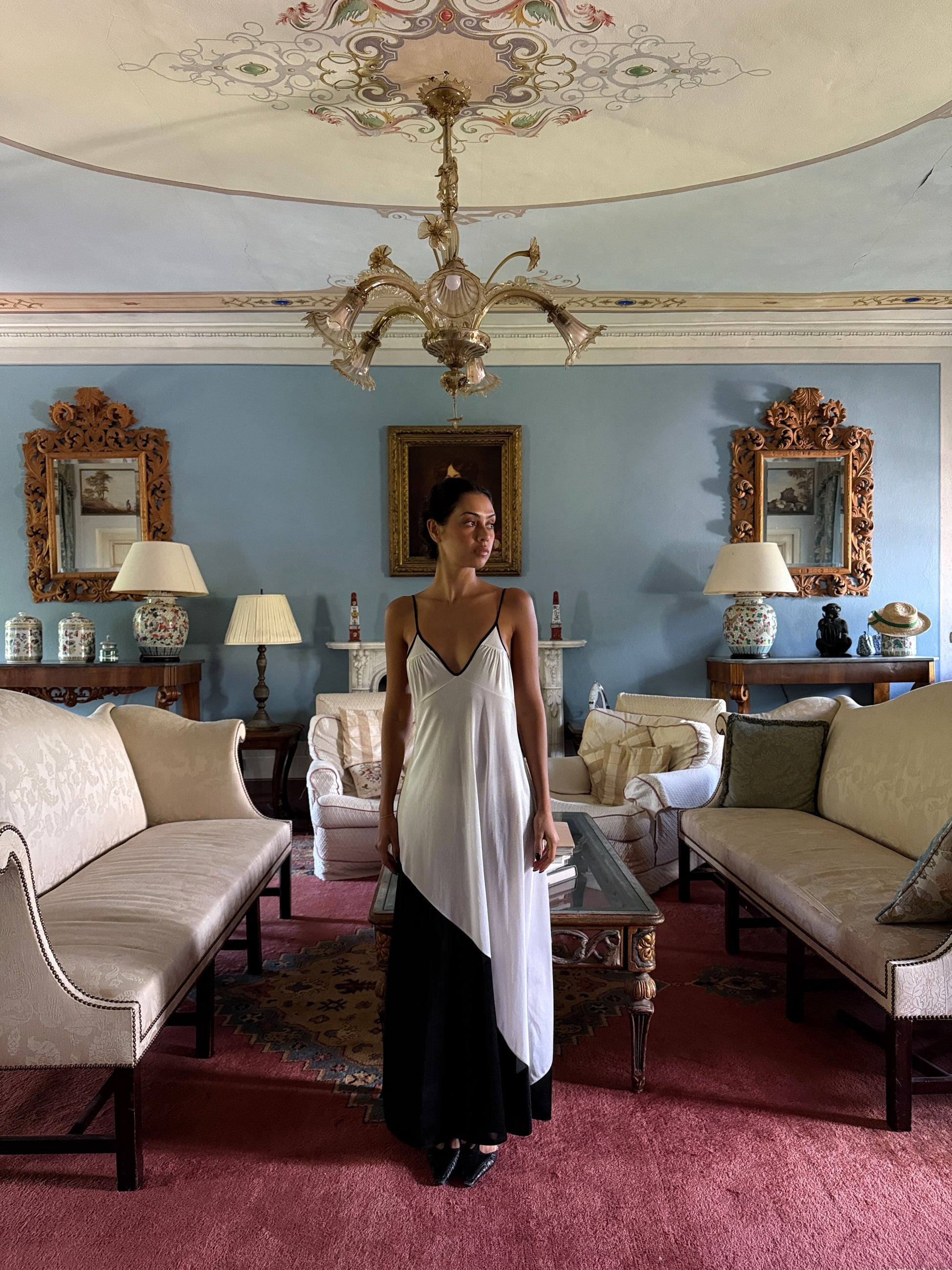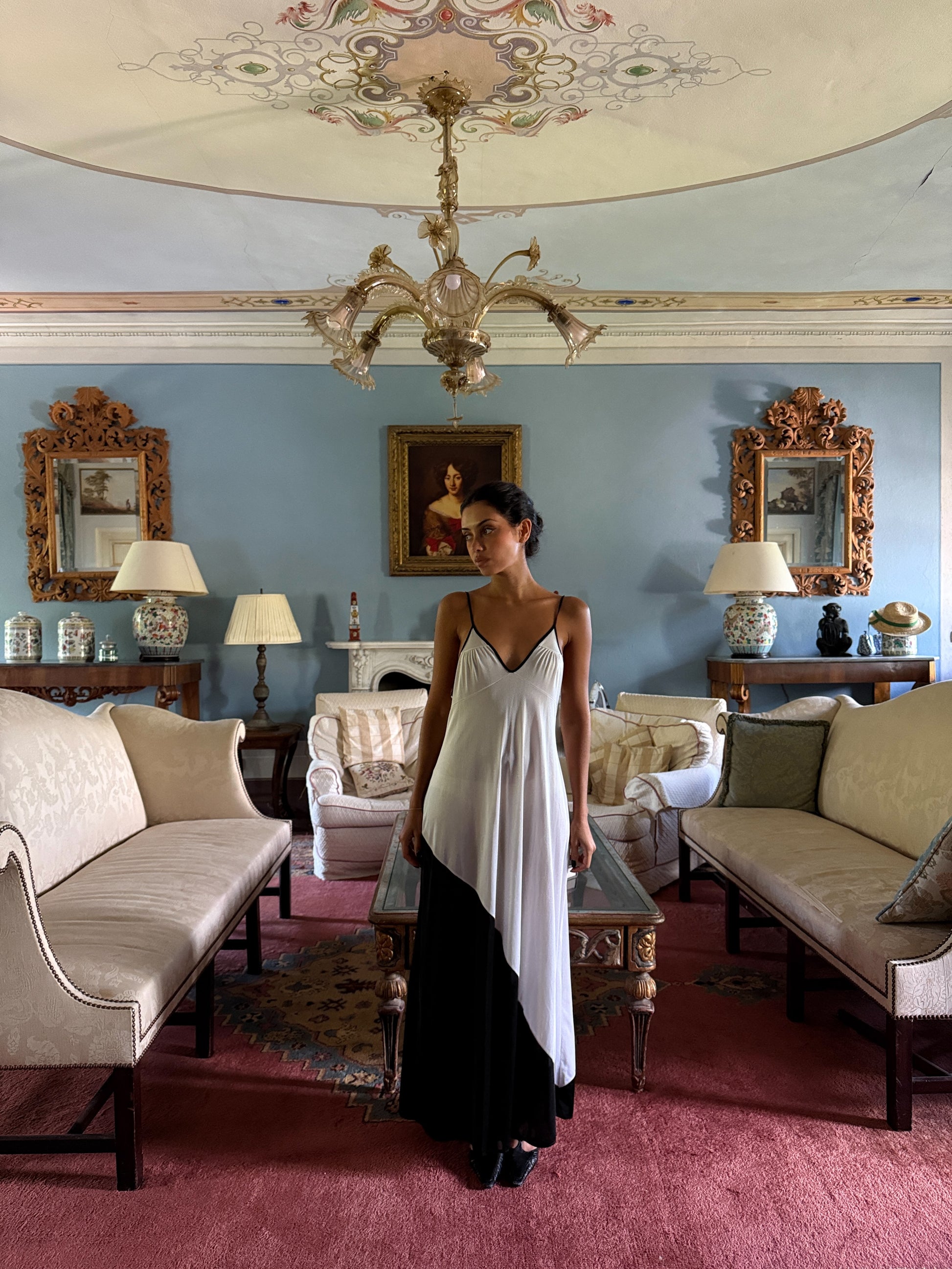 A minimalist black-and-white maxi slip dress with diagonal color-blocking. The white satin-like fabric curves across the body, meeting a black hem for bold contrast. Thin straps and a soft V neckline complete the clean, elegant silhouette.