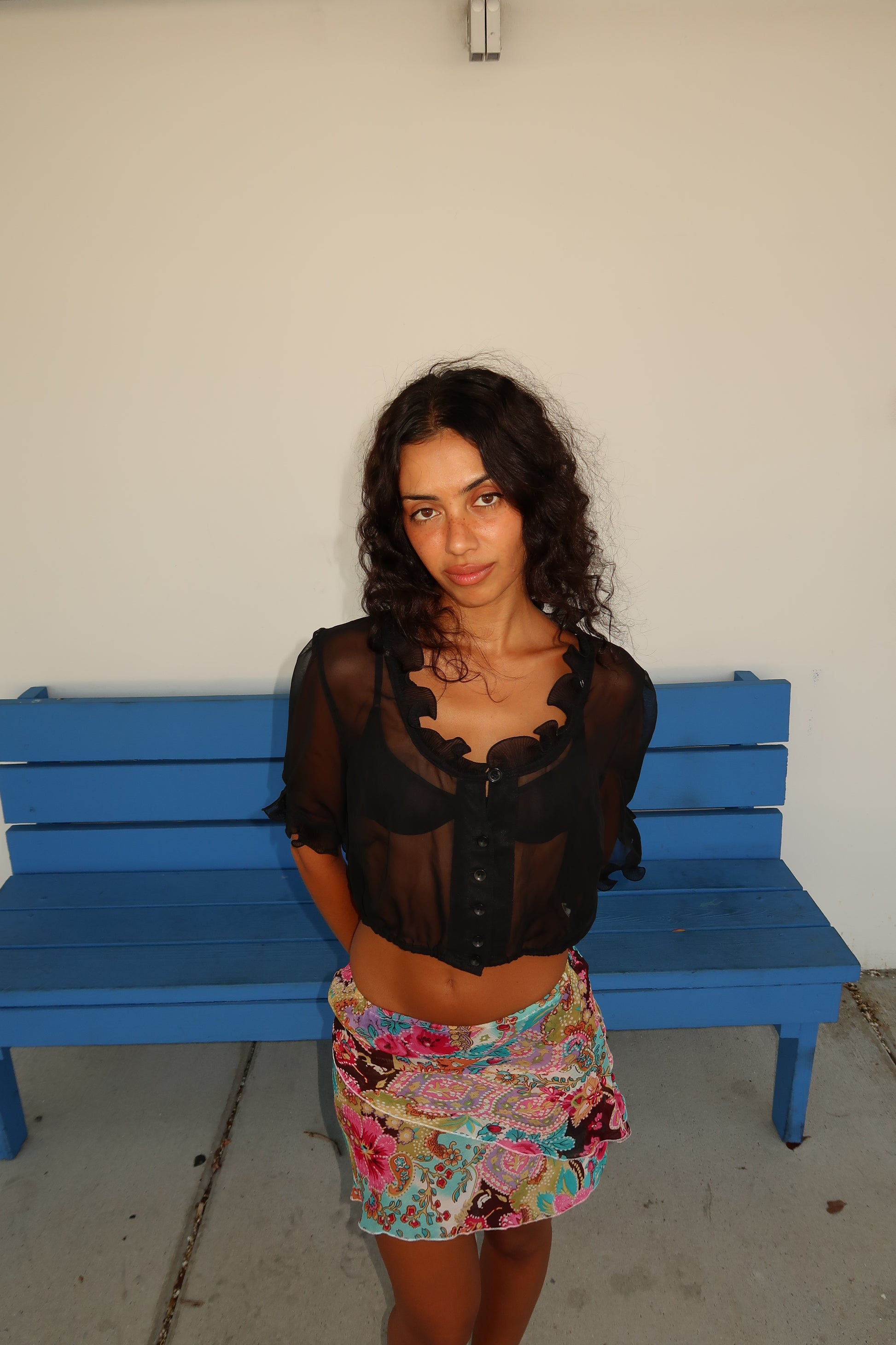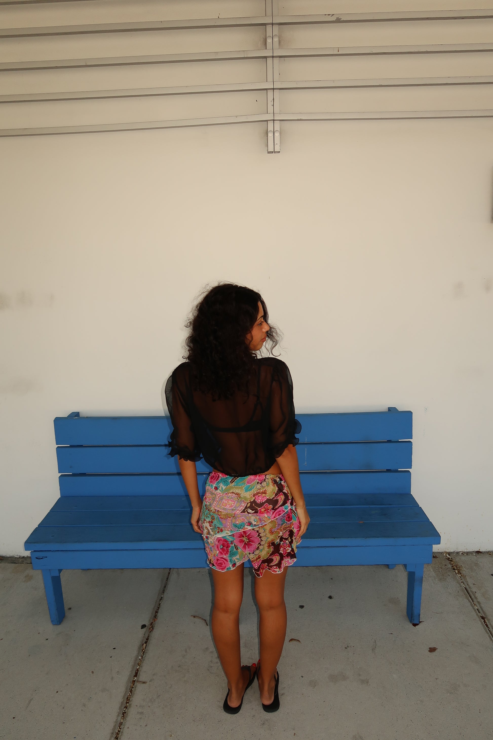Carnival Paisley skirt is a mini skirt with a low-rise fit in a multicolored paisley and floral print with an elastic band and it has a very bohemian feel.