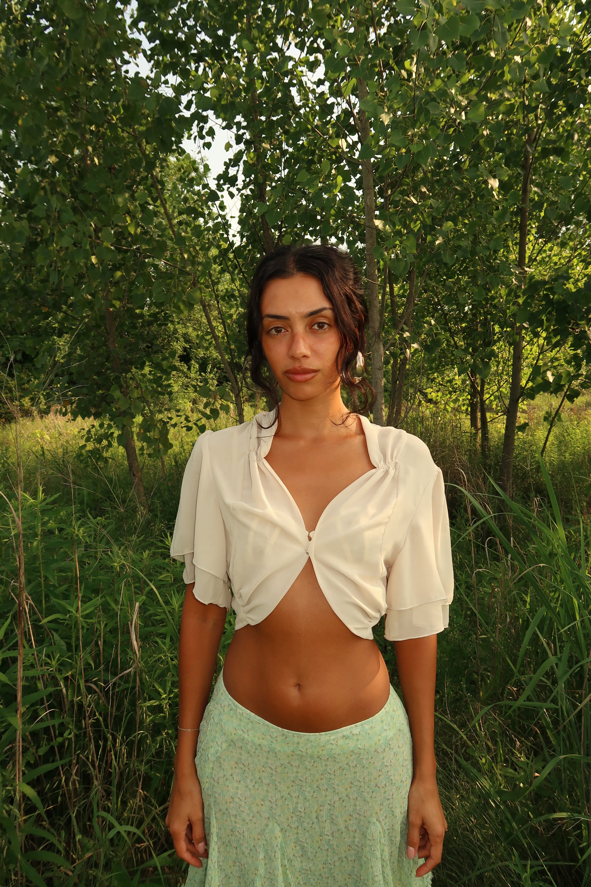 Soft and ethereal, the Cloud Petal Blouse features a lightweight, fluid silhouette with a gathered neckline and subtle front twist closure. The flowy short sleeves and relaxed drape create a romantic, vintage-inspired look with modern ease. This piece can be worn open as a balero or close as a top.