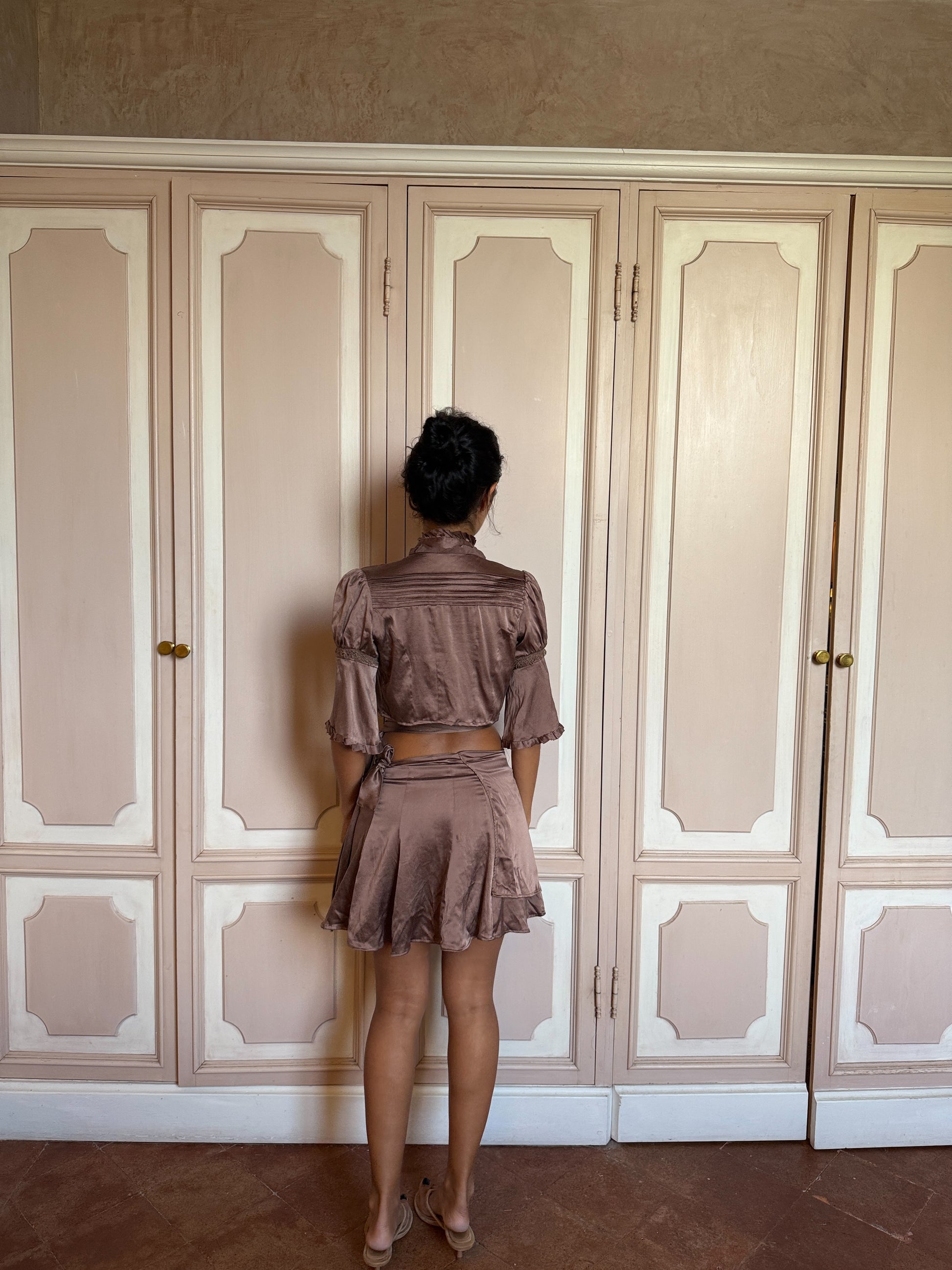 A sensual two-piece wrap set in rich espresso brown satin. The blouse features a plunging neckline with ruffle trim and wrap tie closure. The matching mini skirt sits at the waist and flares slightly for movement.