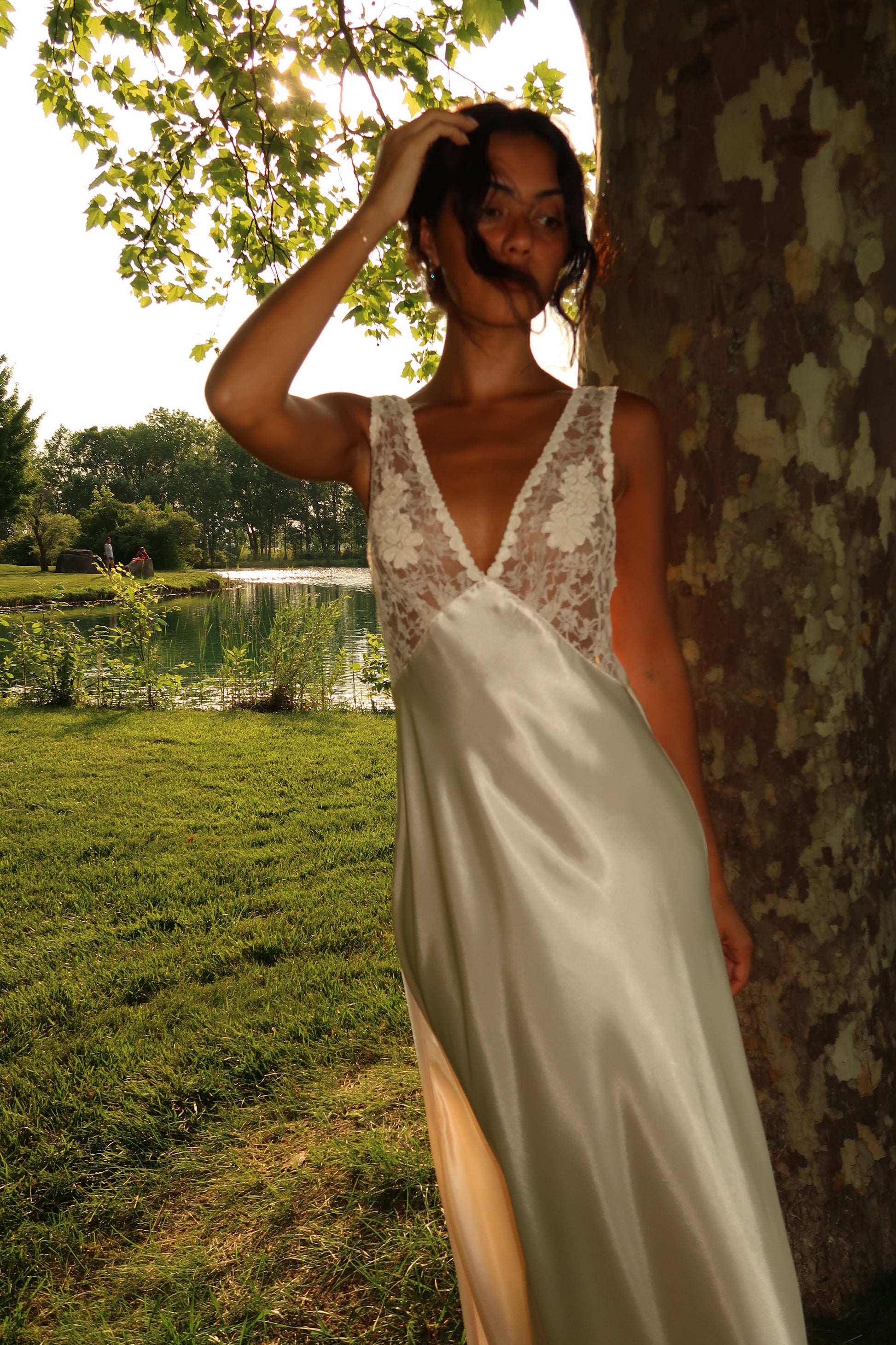 The Luna Blossom Gown captures the essence of moonlit femininity. With a flowing champagne satin skirt that cascades like liquid light and a plunging V-neckline adorned in sheer floral lace, and embroidered daisies bloom