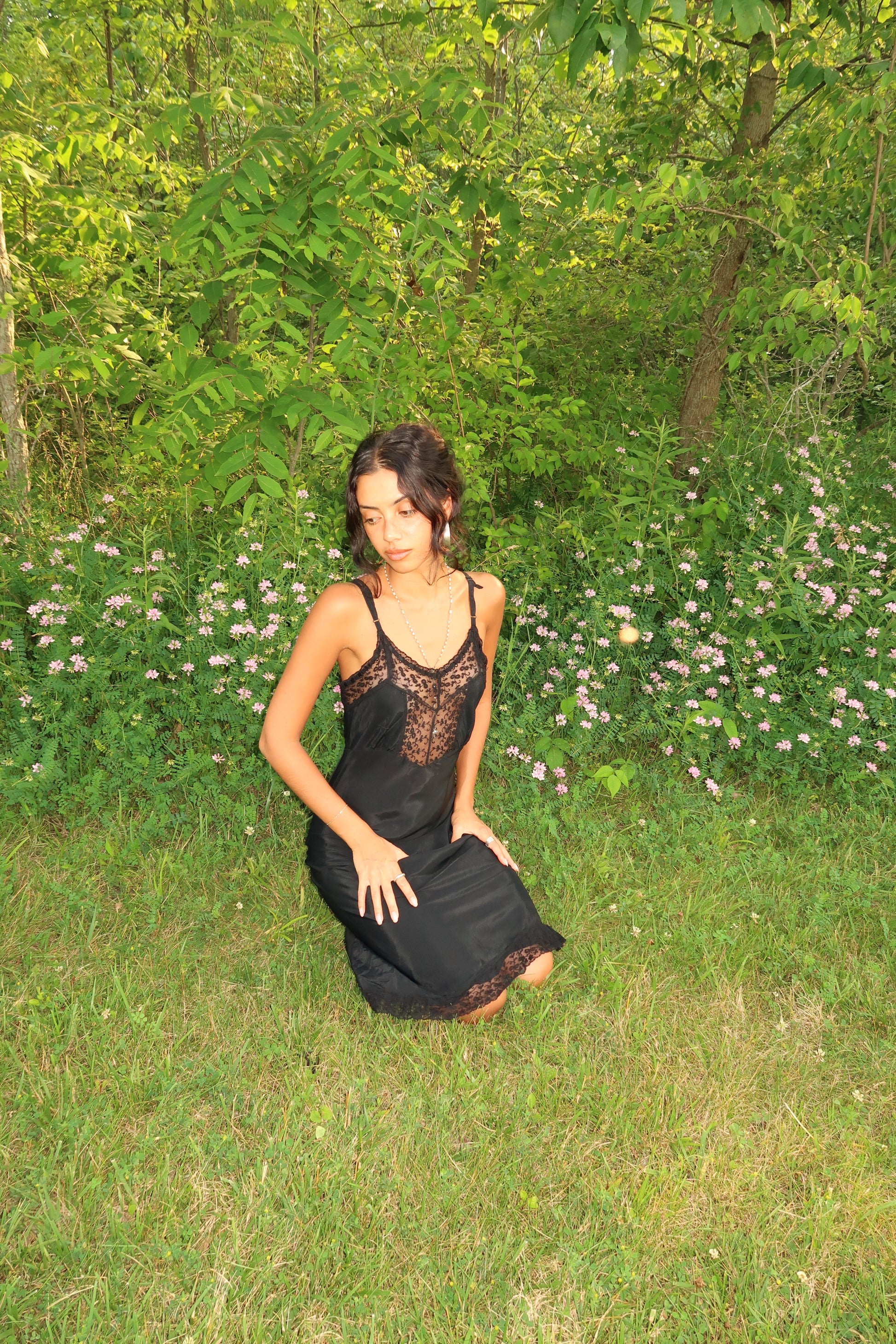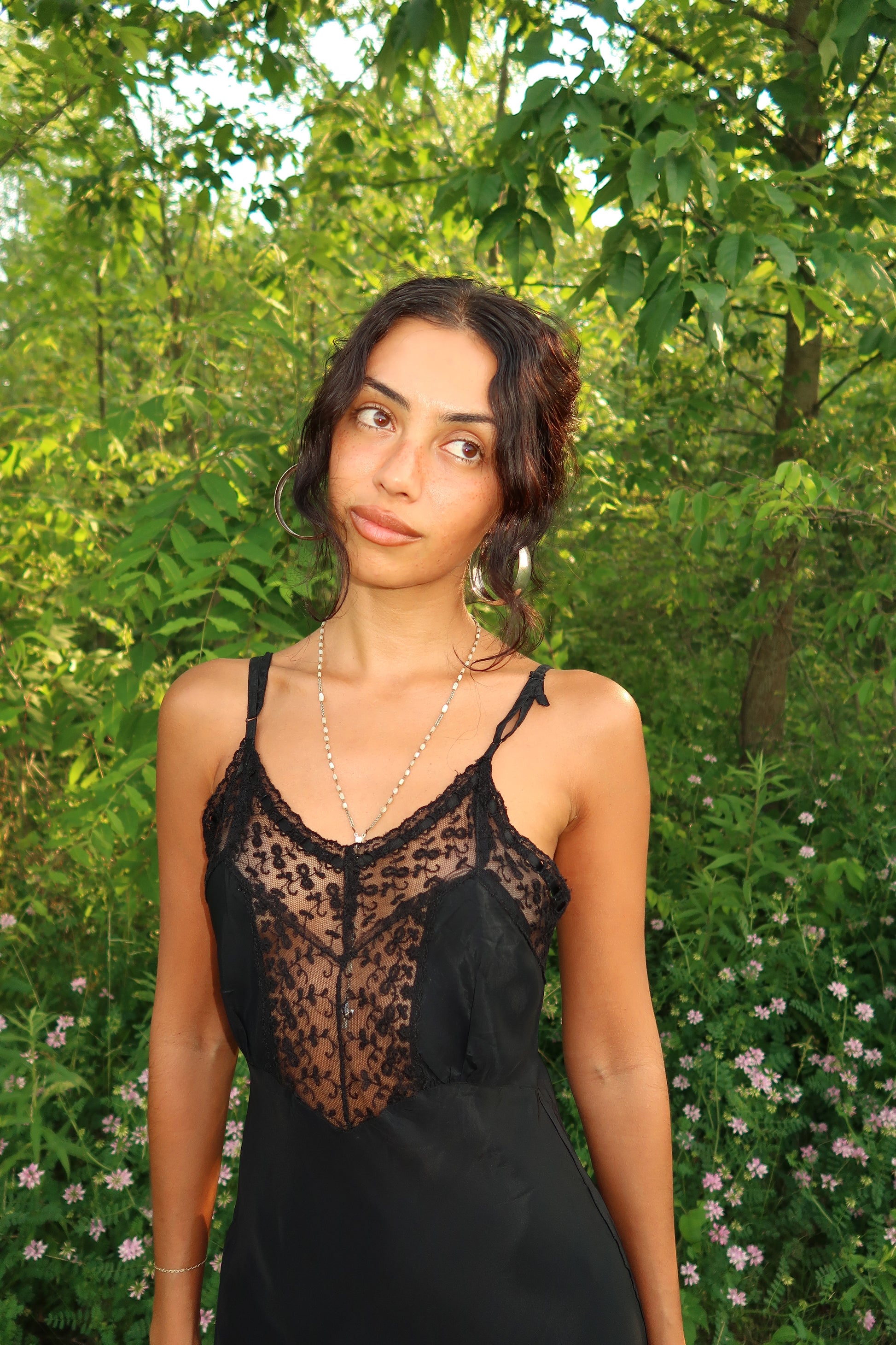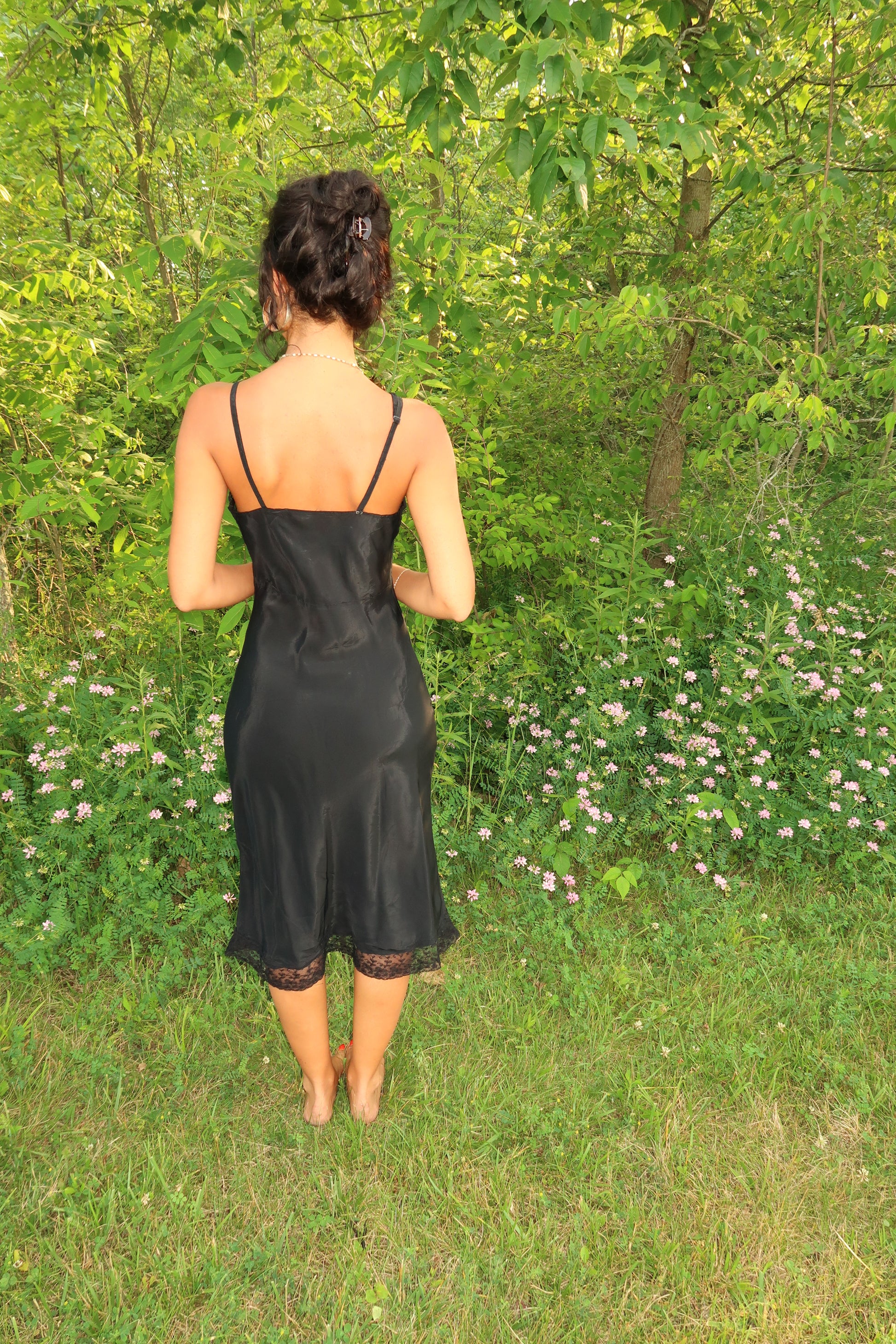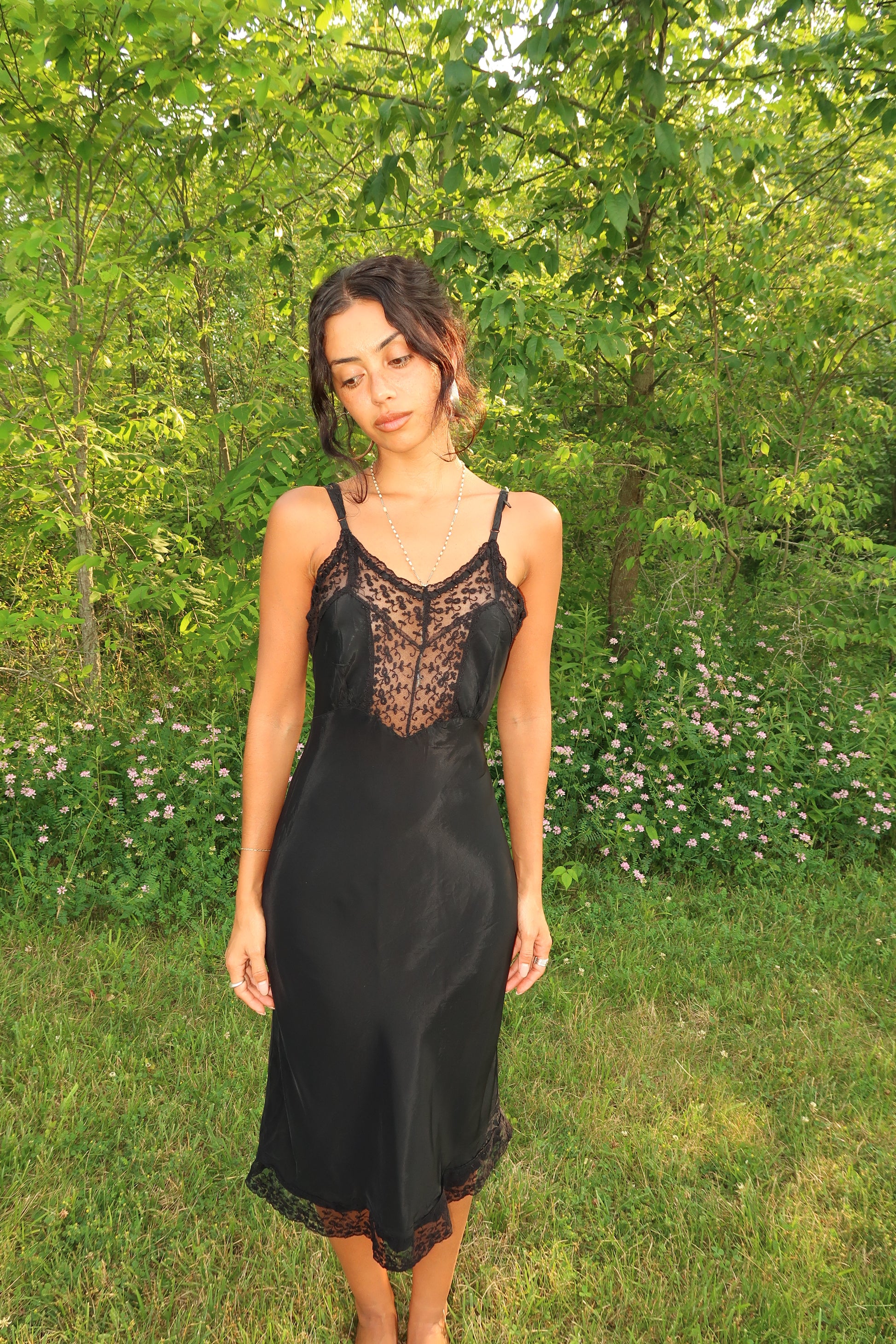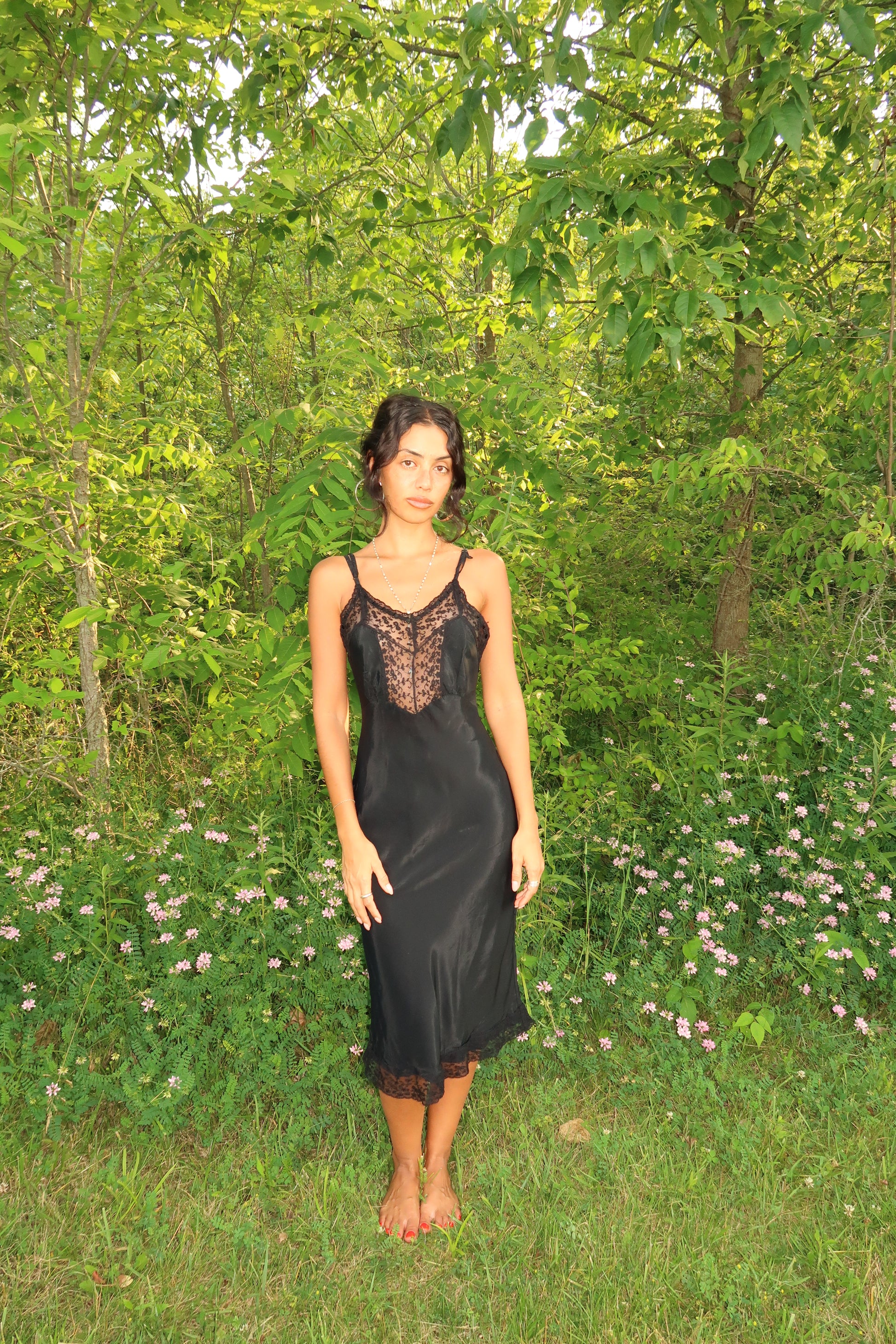 The Moonlight Widow Slip is a hauntingly elegant vintage-inspired slip dress that whispers of mystery and midnight romance. Crafted in a slinky, body-skimming black satin, it features a sheer lace panel along the bust with delicate floral embroidery and scalloped edges that add a sultry softness. Adjustable straps and lace-trimmed hem complete the silhouette, making it perfect for moonlit soirées, poetic mornings, or intimate dinners.