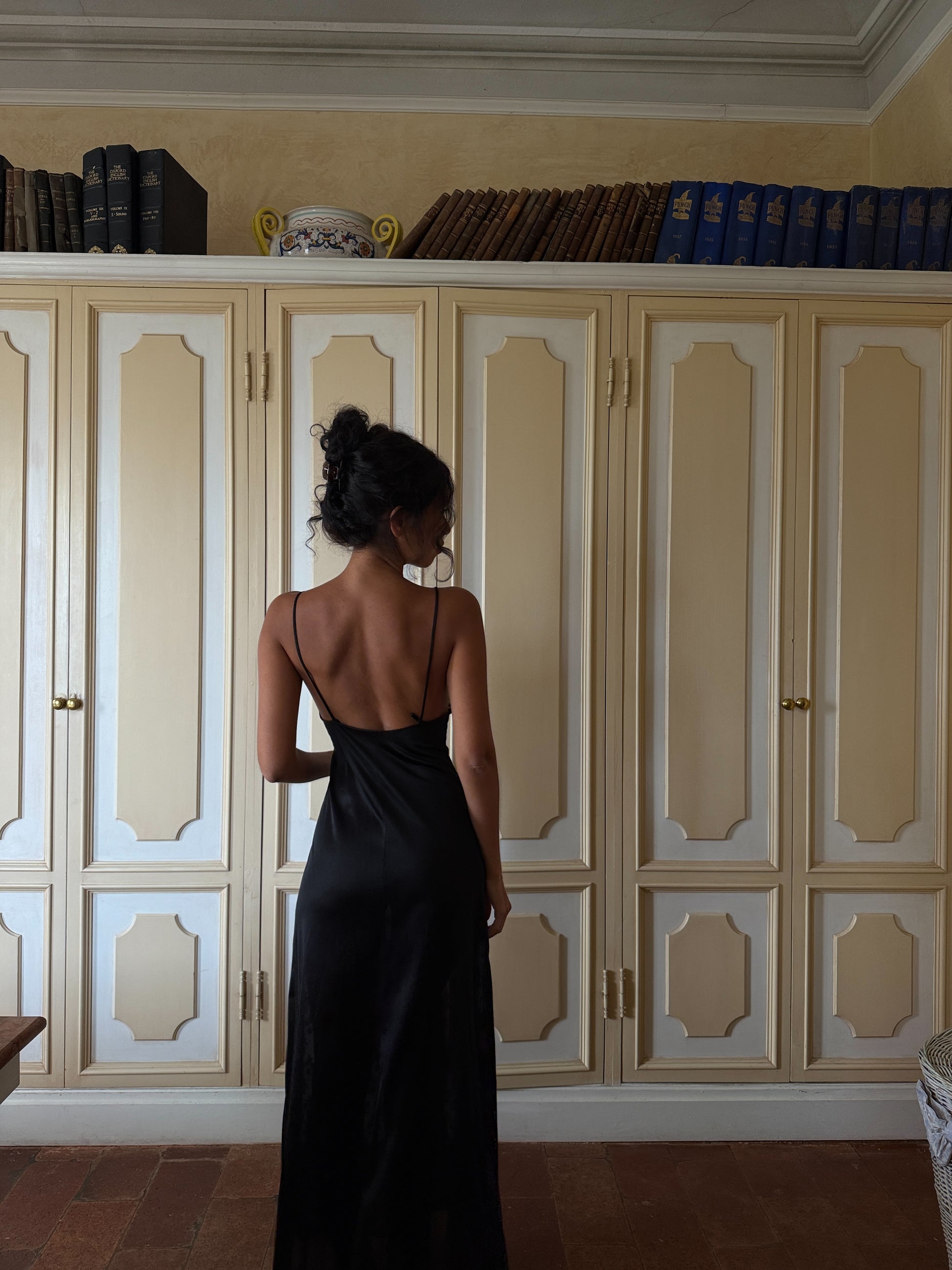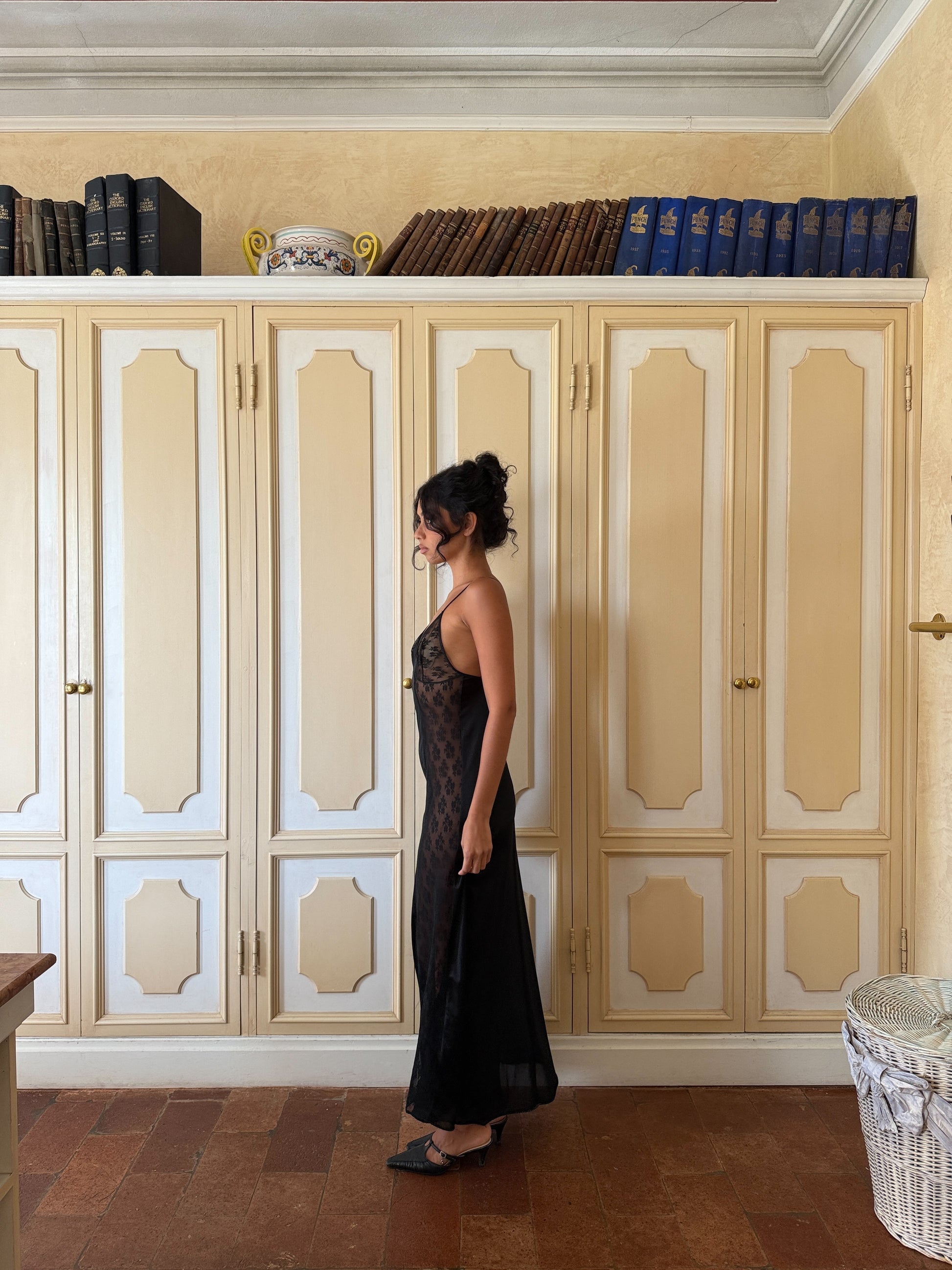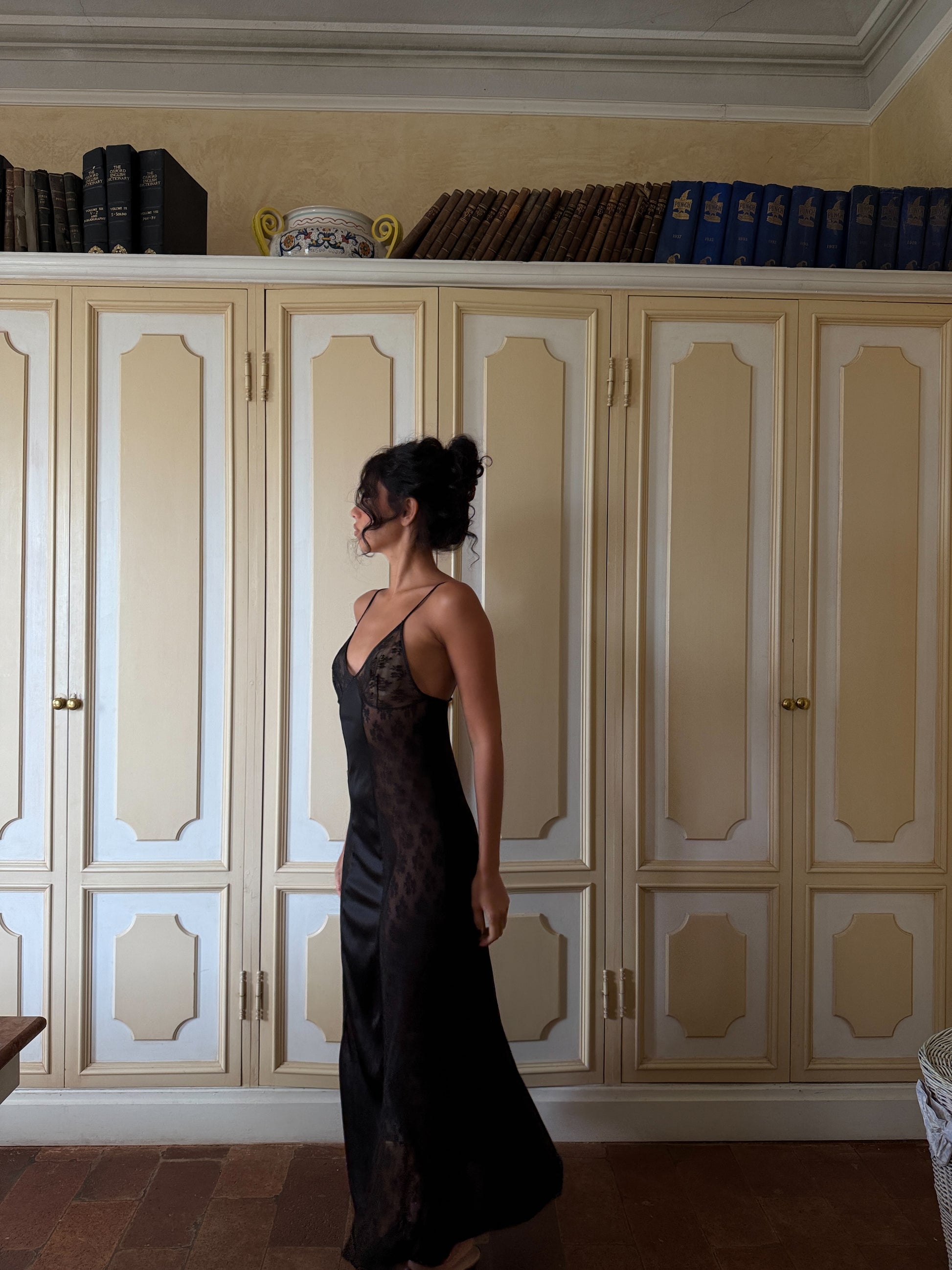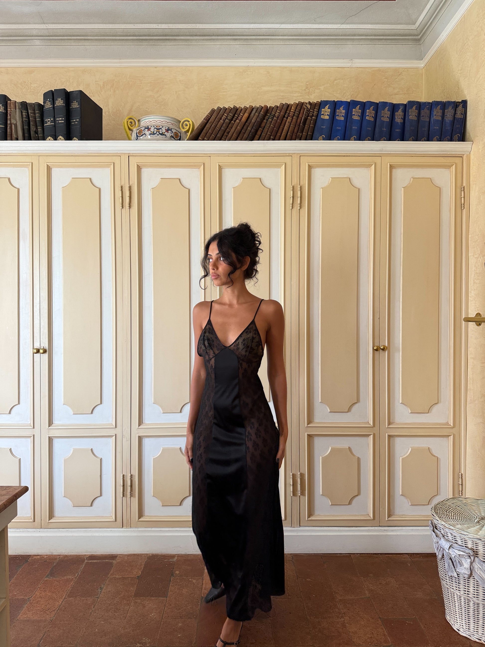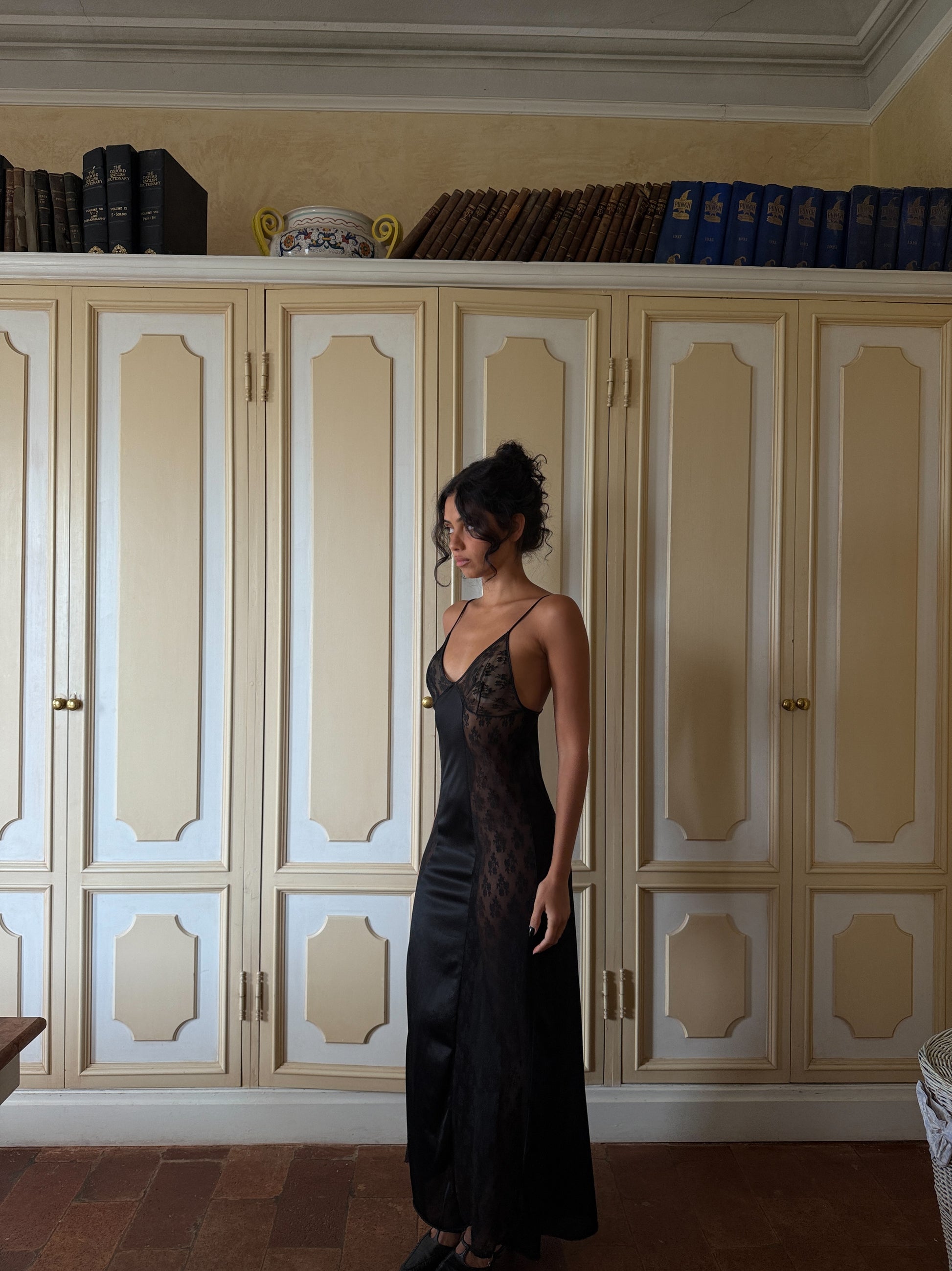 A striking full-length slip dress in black satin with sheer lace panels down the sides and bust. The bodice features triangle cups and a low-cut V neckline, supported by delicate spaghetti straps. The lace provides a subtle glimpse of skin, while the silhouette remains long and sleek.