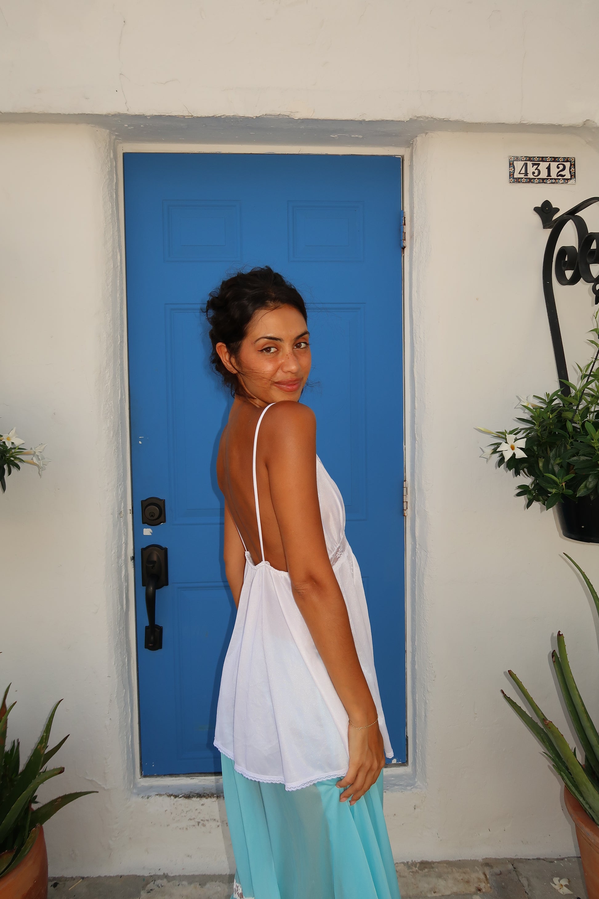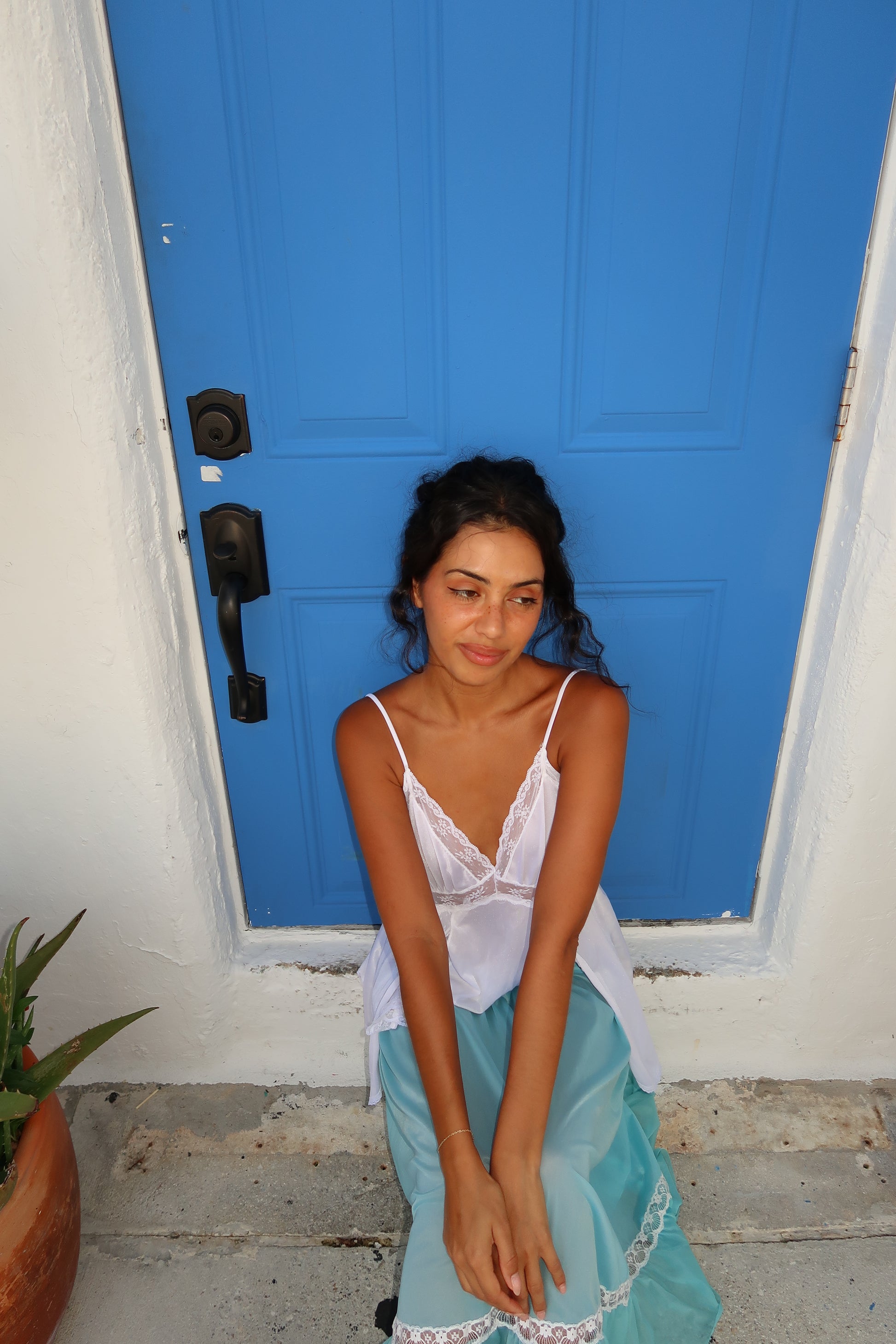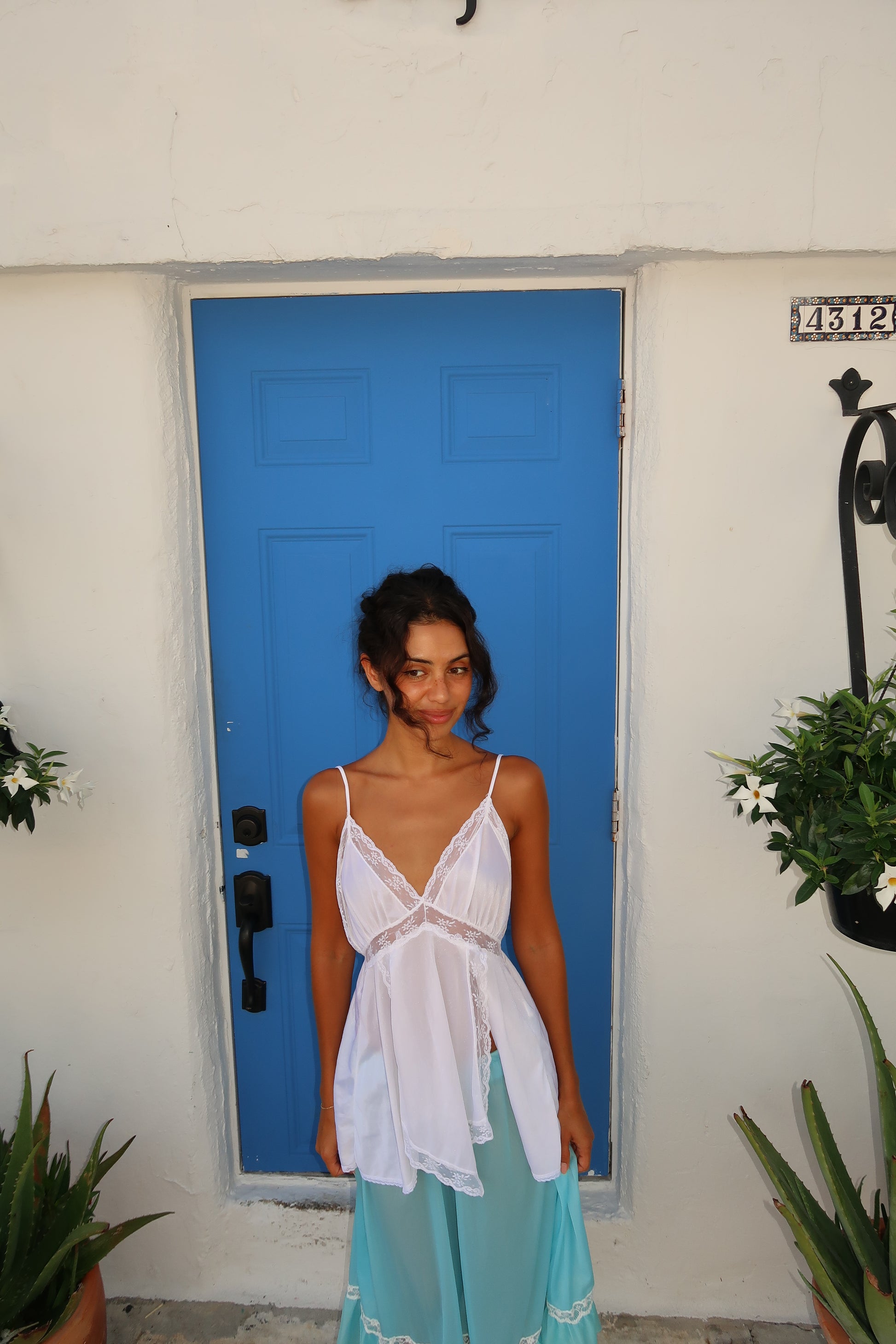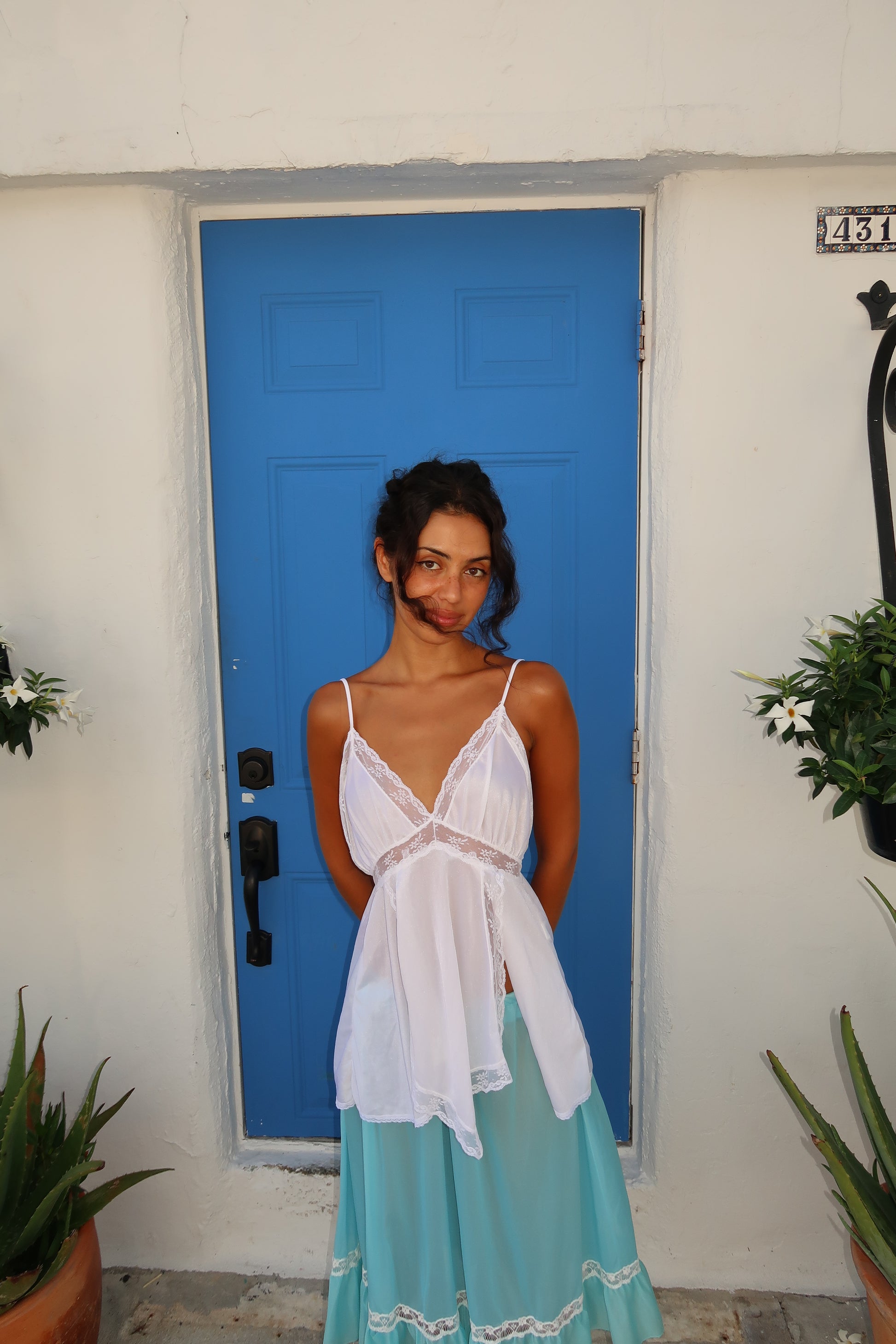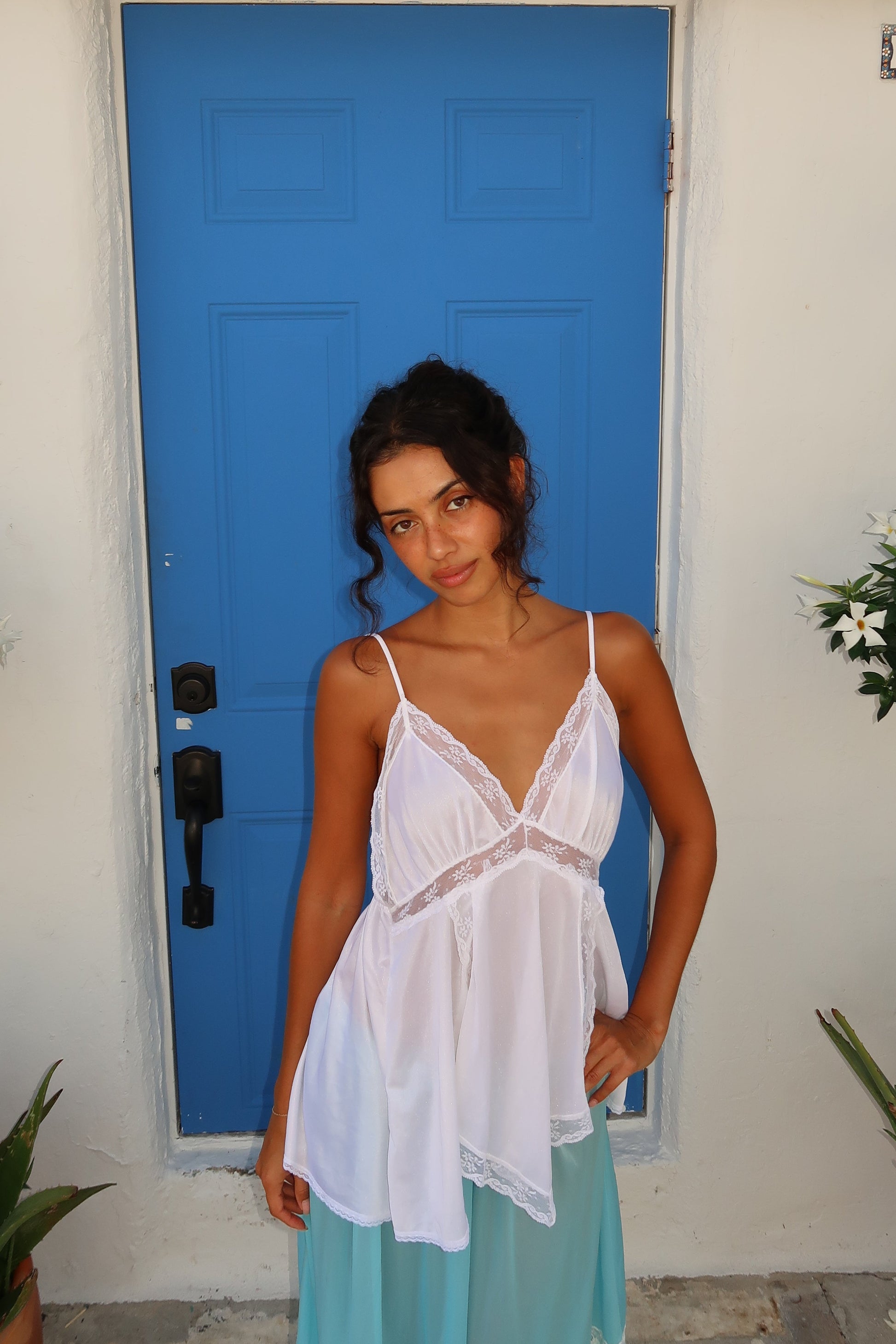 Ocean Whispers is a white camisole-style blouse with spaghetti straps, lace trimming, and a flowing handkerchief hem. The bodice has a deep V neckline with lace insets, adding a delicate, feminine feel.