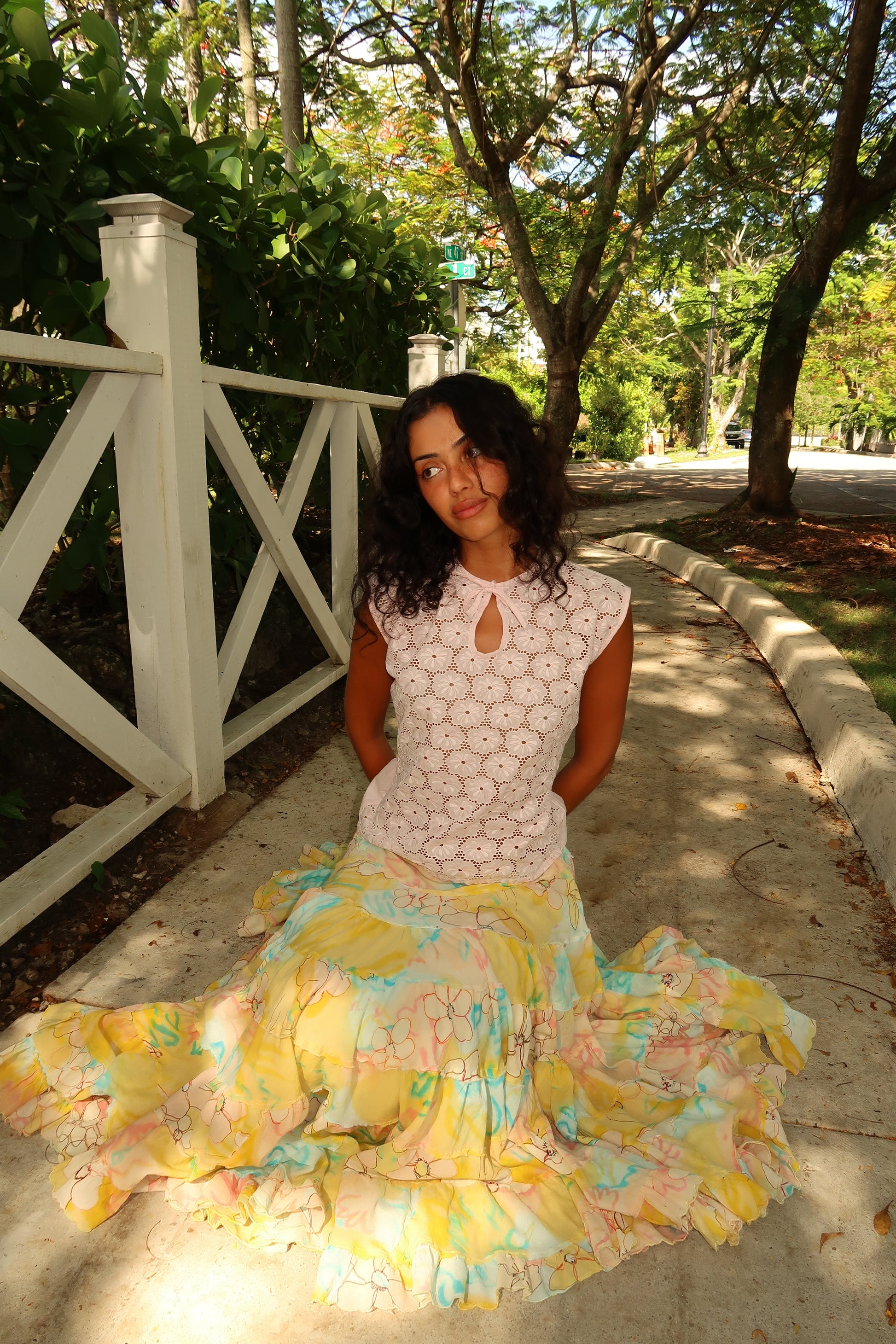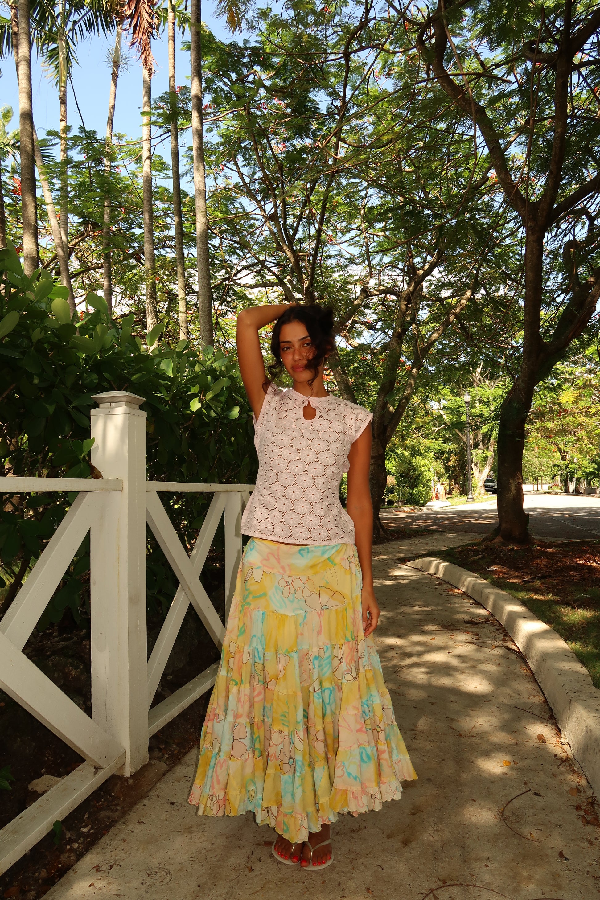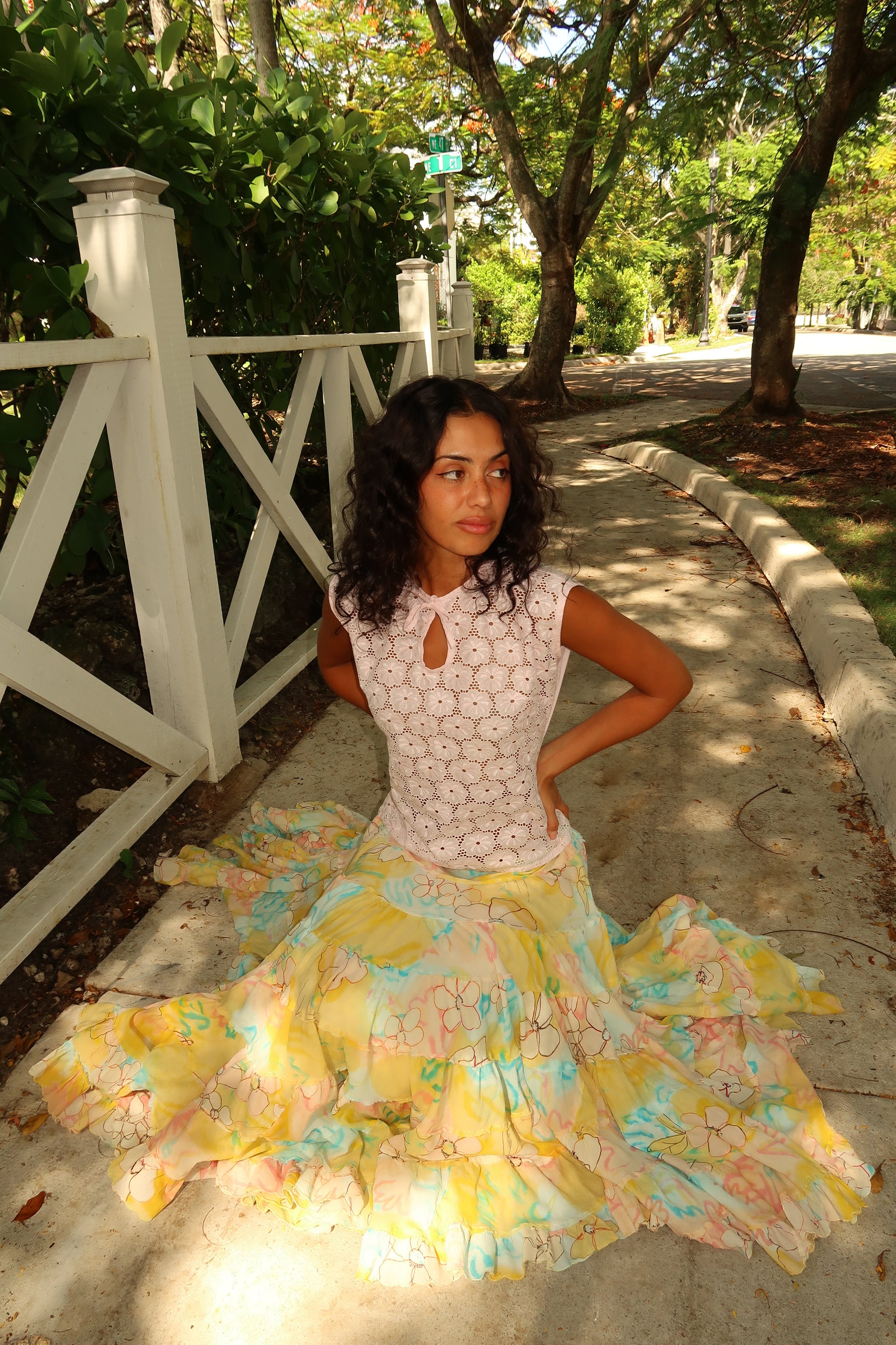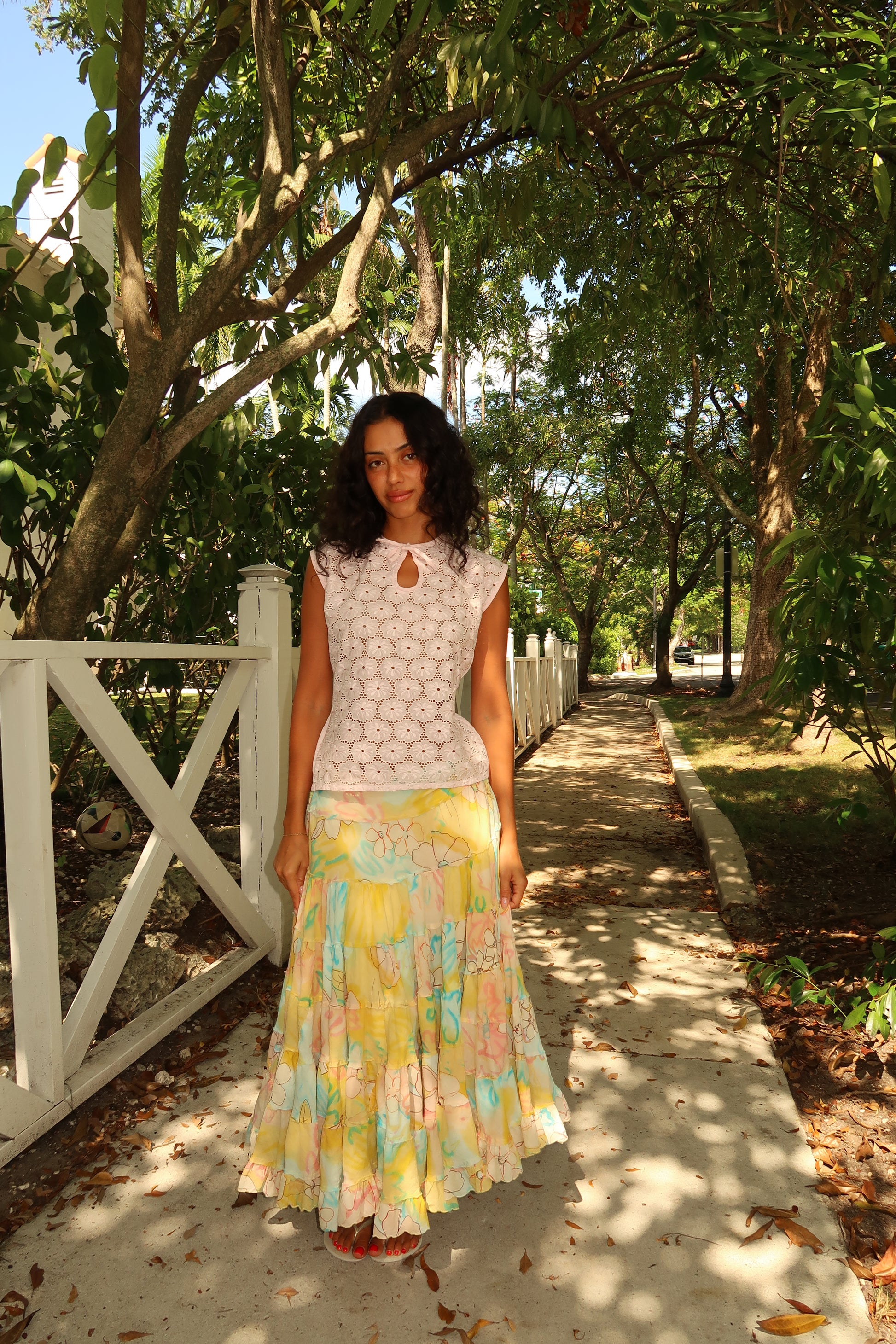 Pastel Garden Set is a fitted blouse size (small) in white eyelet lace with a delicate keyhole neckline at the front and button-down detail at the back. The cut cinches slightly at the waist, creating a flattering silhouette. Skirt is size (medium) tiered maxi skirt with a flared flow. The fabric is airy and light, decorated in pastel watercolor shades with abstract floral outlines.