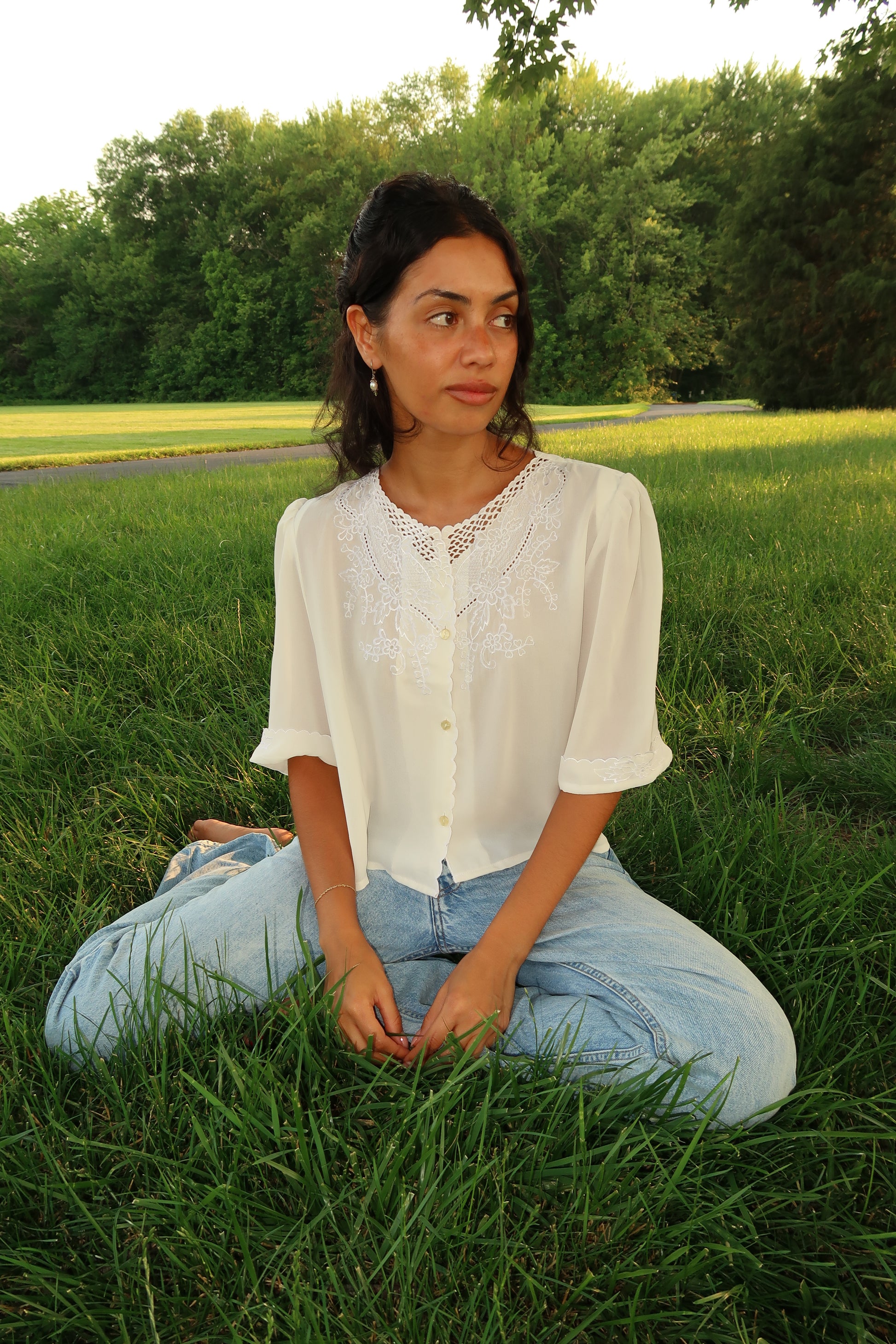 The Pearl Bloom Blouse captures delicate beauty with its soft silhouette, intricate floral embroidery, and scalloped trim. Featuring a romantic crochet neckline and dainty pearl-like buttons, it blends vintage charm with everyday grace. Its airy fabric and relaxed fit make it ideal for sun-drenched days or quiet moments under the trees.