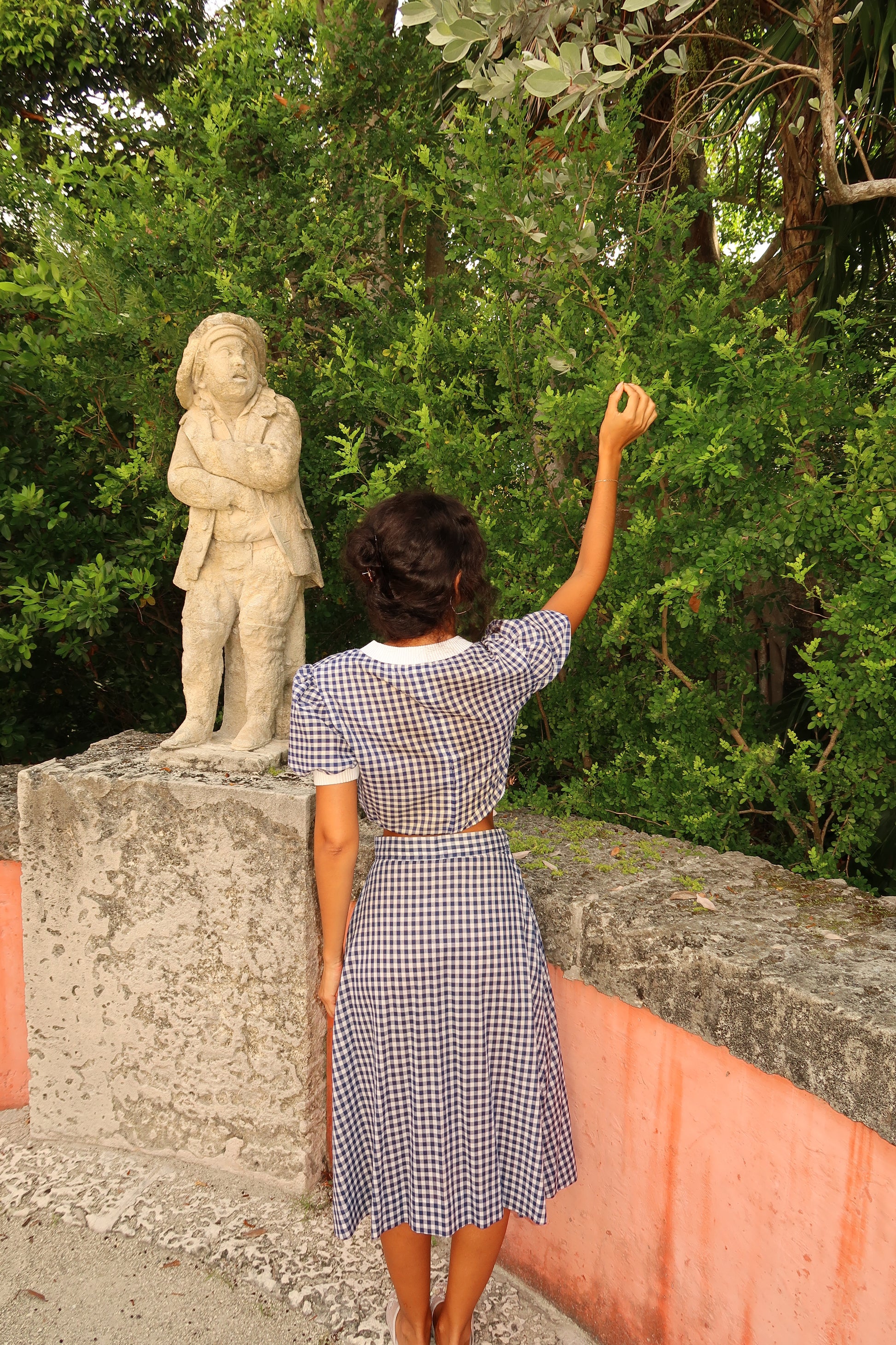 Picnic gingham Set is a two-piece set with a cropped top and a high-waisted midi skirt. Top: Puff short sleeves, deep V neckline with a contrasting white ribbed trim, giving it a sporty-meets-feminine edge.