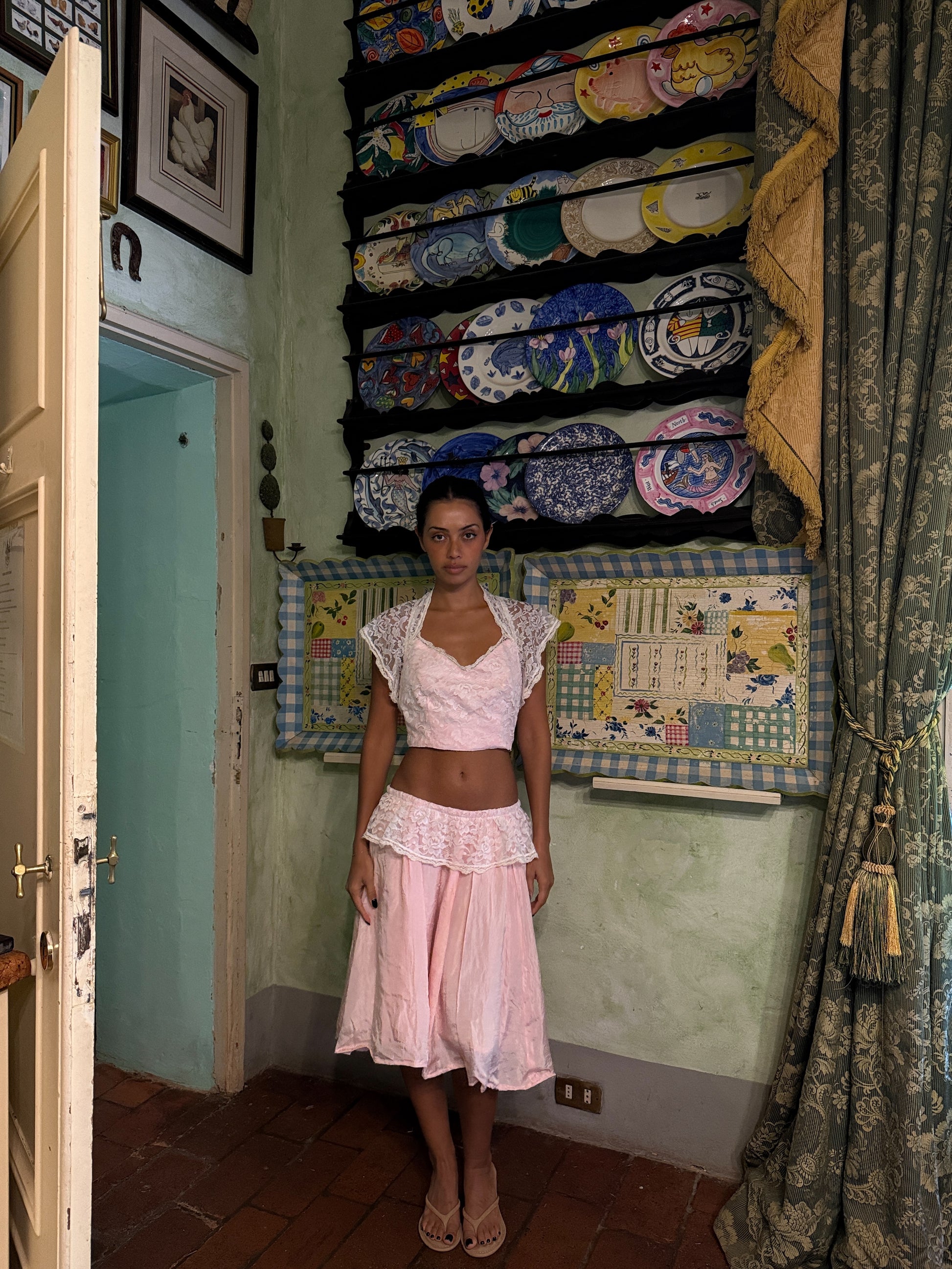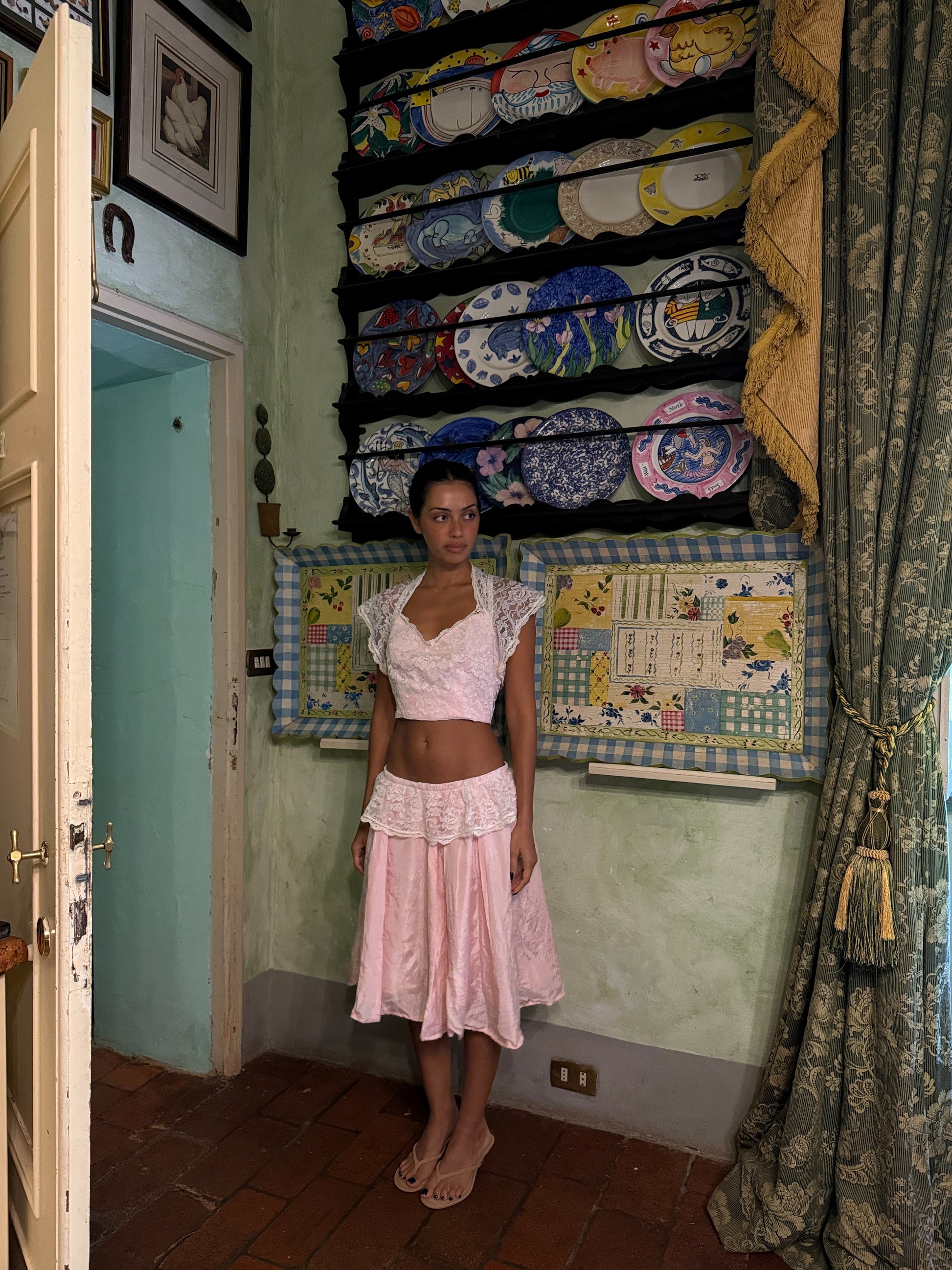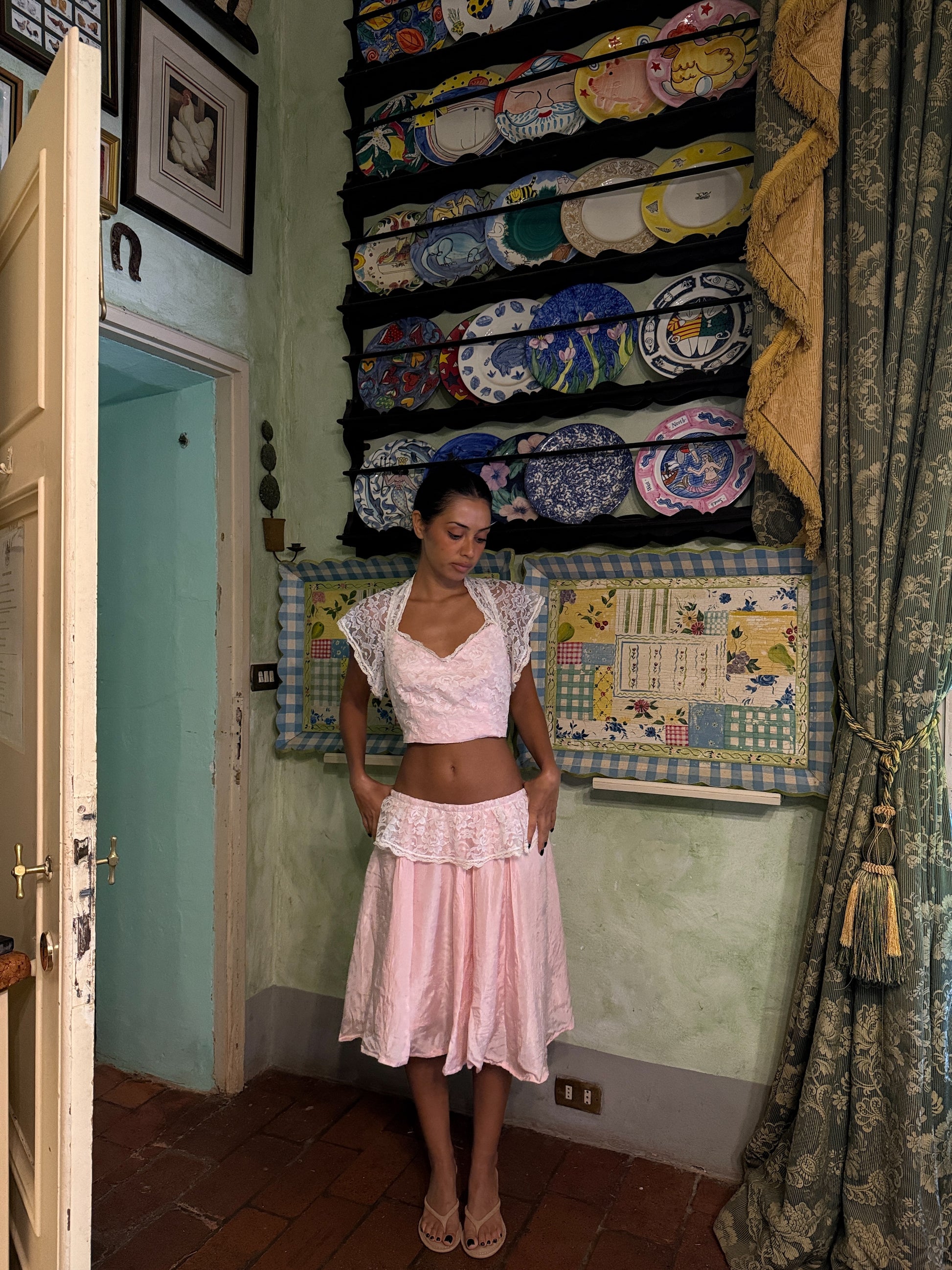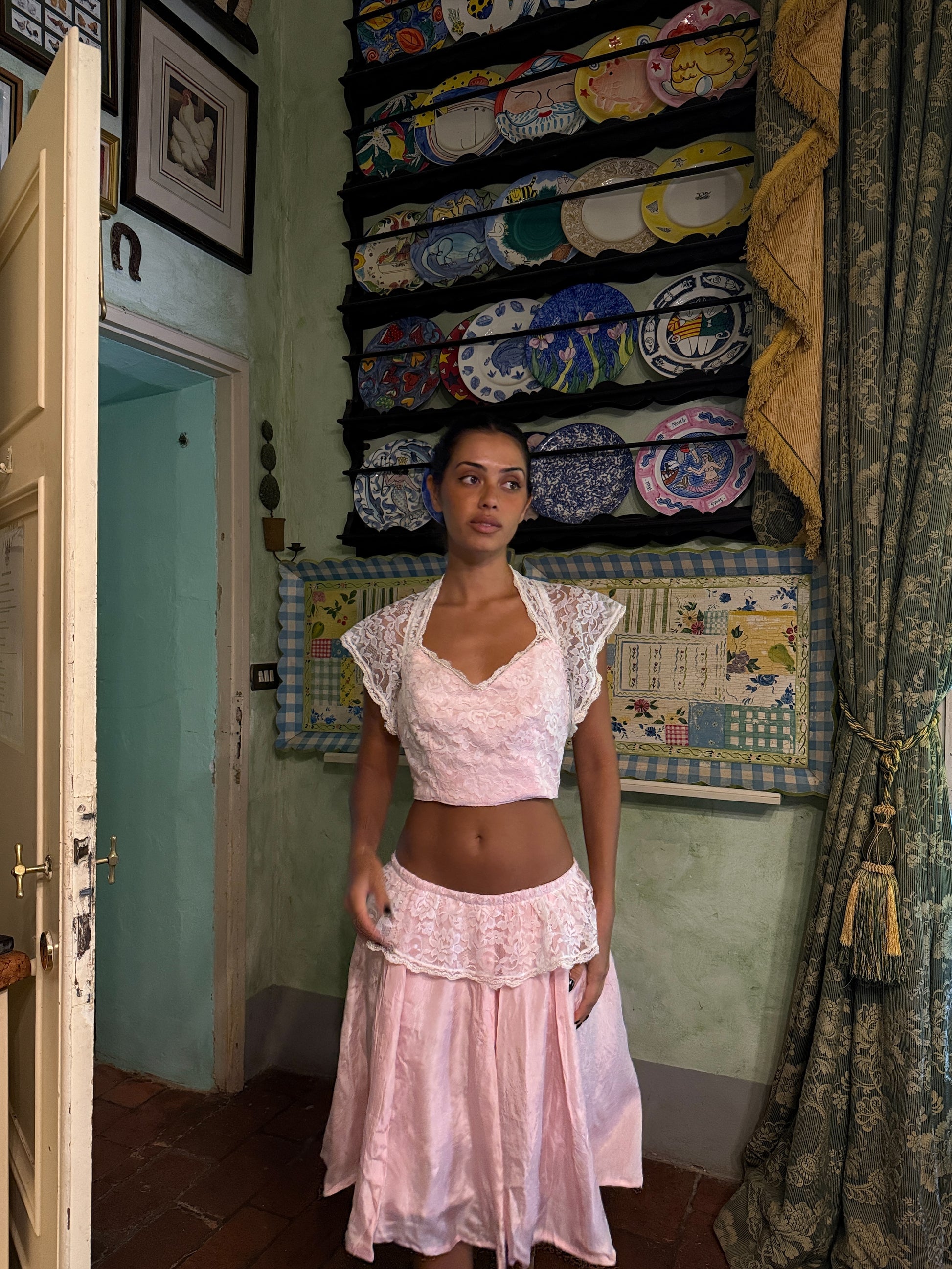 A soft and feminine two-piece set in a pale blush pink, combining romantic lace with crinkled satin textures. The cropped top features a wide V-neckline framed by lace-trimmed cap sleeves and a gently structured bust. The matching skirt sits high on the waist, with a lace peplum detail that adds shape and movement above the softly flared hem.