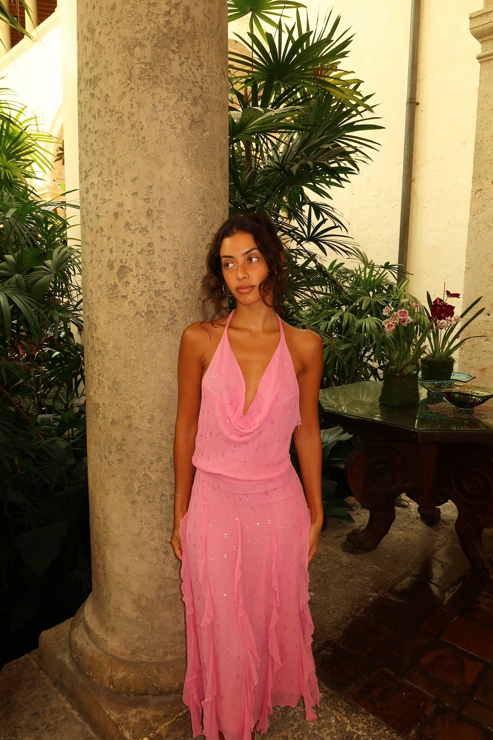 Rosé Stardust Gown flowing halter maxi dress with a draped cowl neckline and a fitted waist that transitions into a soft, layered skirt.