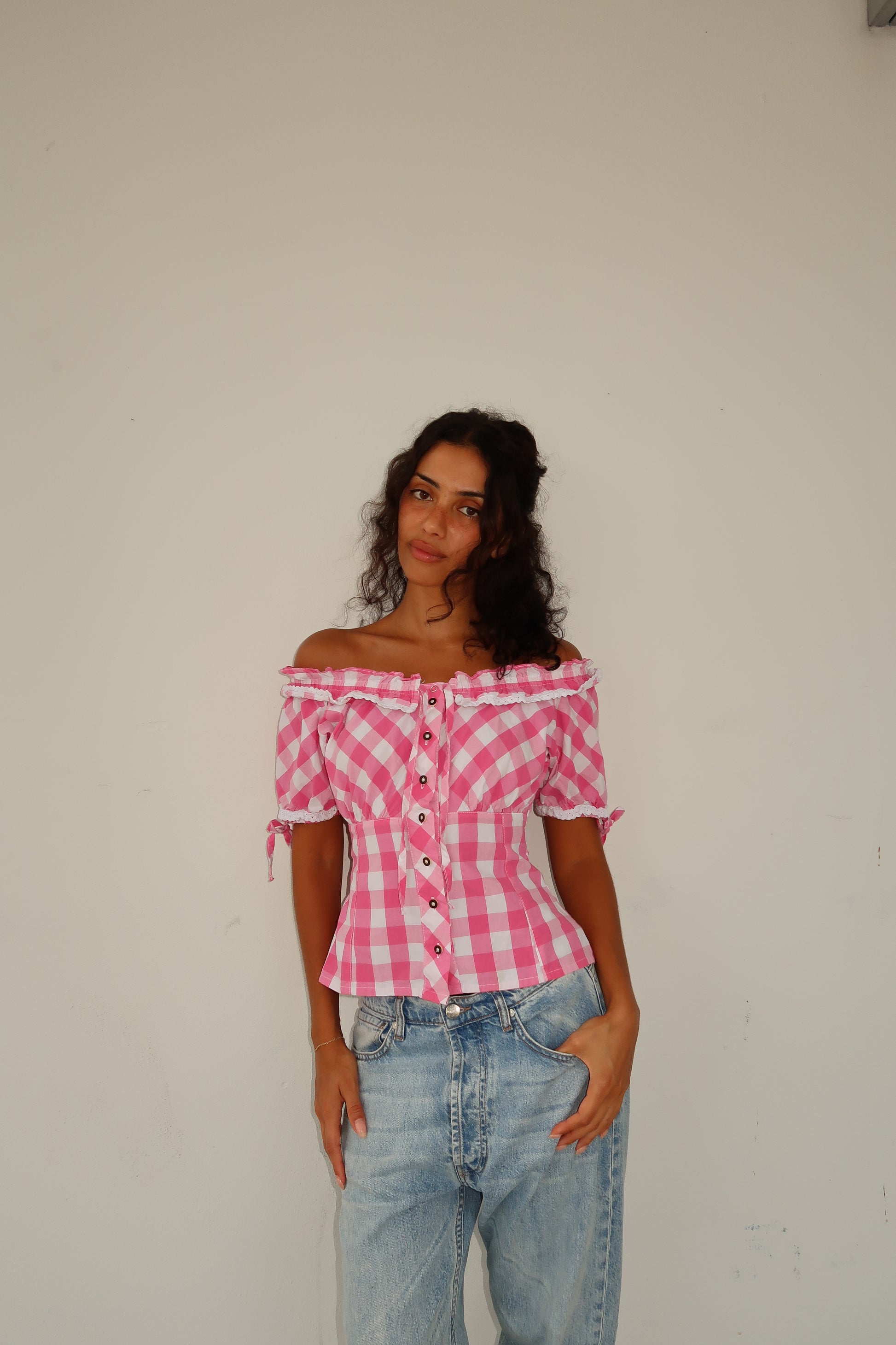 Rosie Gingham Blouse is an off-the-shoulder blouse with a fitted bodice, button-down front, and puffed short sleeves. White lace trim along the neckline and sleeve edges adds a sweet, romantic detail. The sleeves tie with little bows at the ends, and the structured waist creates a flattering, corset-like