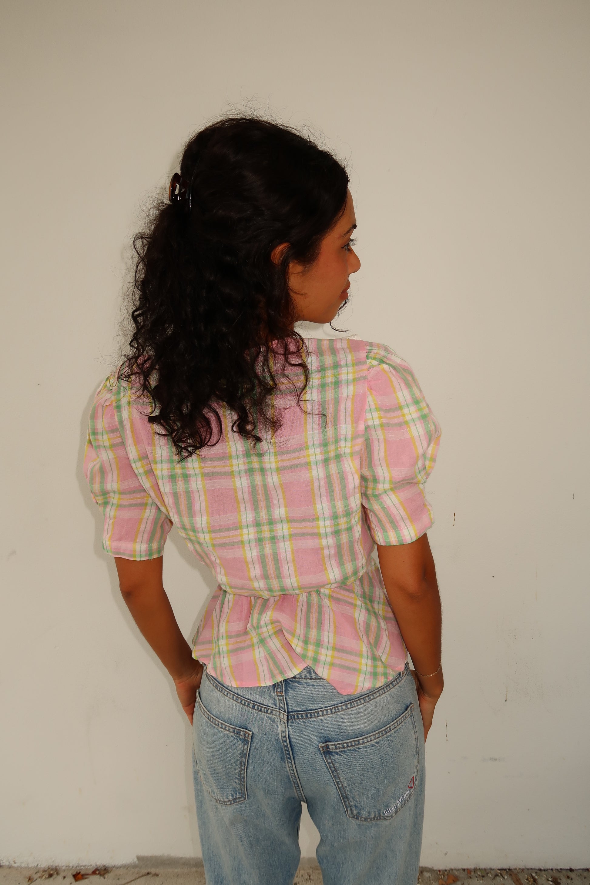 Sonnet wrap blouse with short puff sleeves and a slightly flared peplum hem. Deep V neckline trimmed with a wide scalloped white lace collar, giving it a romantic, old-fashioned touch. A side tie cinches the waist for a flattering fit.