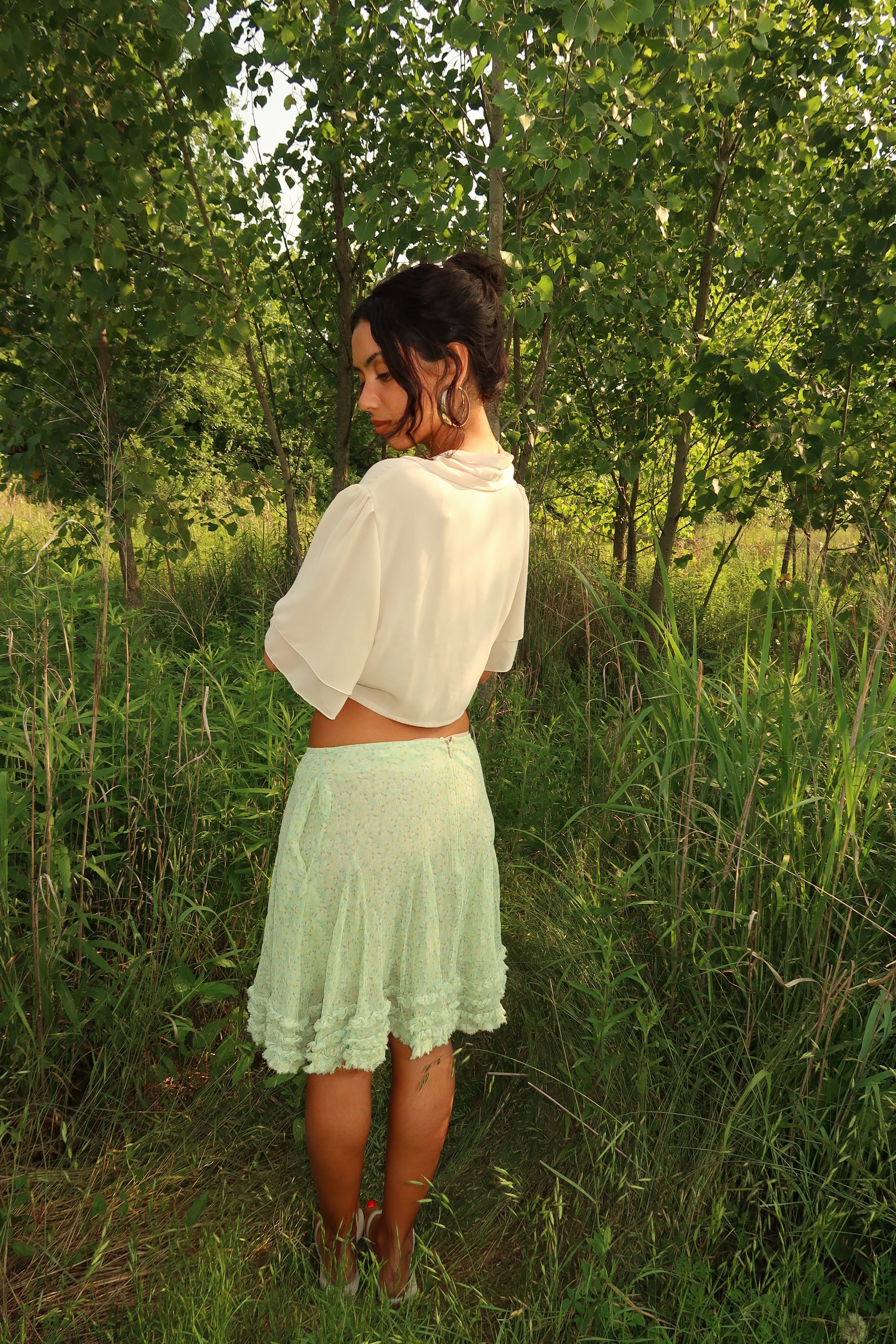 The stella mccartney vintage Skirt is a breezy, mid-length skirt with delicate floral detailing and a playful flared hemline. It features ruffled trim at the bottom and is crafted in a soft pastel mint with tiny yellow florals, giving it a fresh, countryside feel.