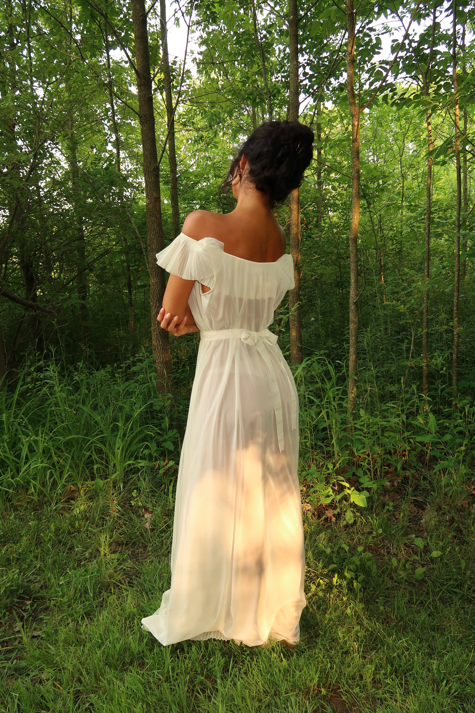 The Sylvan Muse Gown floats like a breeze through a forest clearing—gentle, romantic, and rooted in mythic femininity. Featuring a softly pleated texture, an off-the-shoulder neckline, and a cinched waistline, this ivory gown has a tie in the back which can be adjusted based on your preference around the waist.