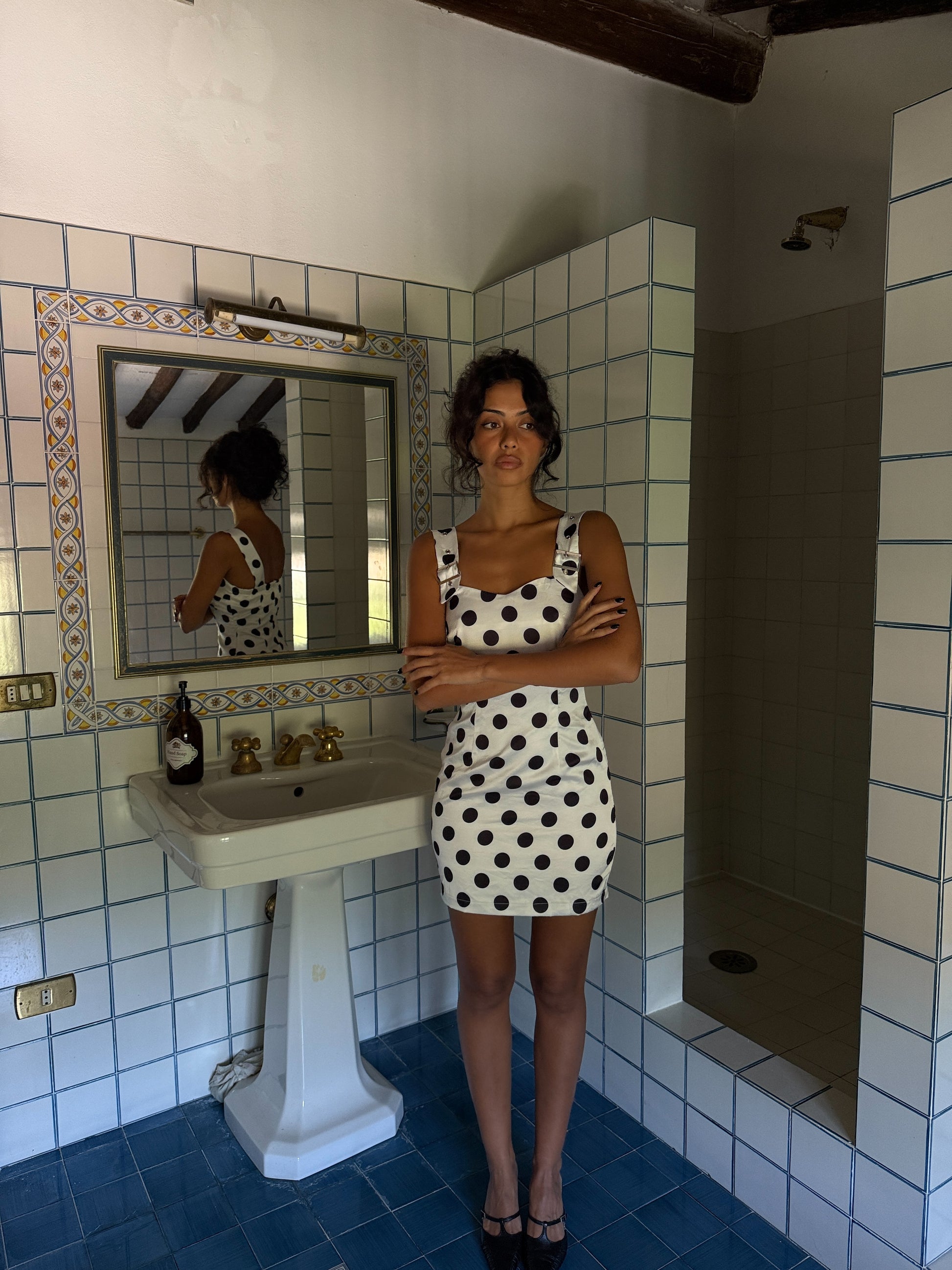 Playful, poised, and unmistakably bold — the Costa Dress is a sun-drenched ode to Mediterranean summers and vintage charm. Crafted in a structured cotton-blend canvas with dramatic black polka dots on ivory, it features wide shoulder straps with tonal buttons, a square neckline, and a tailored mini silhouette that hugs without clinging.