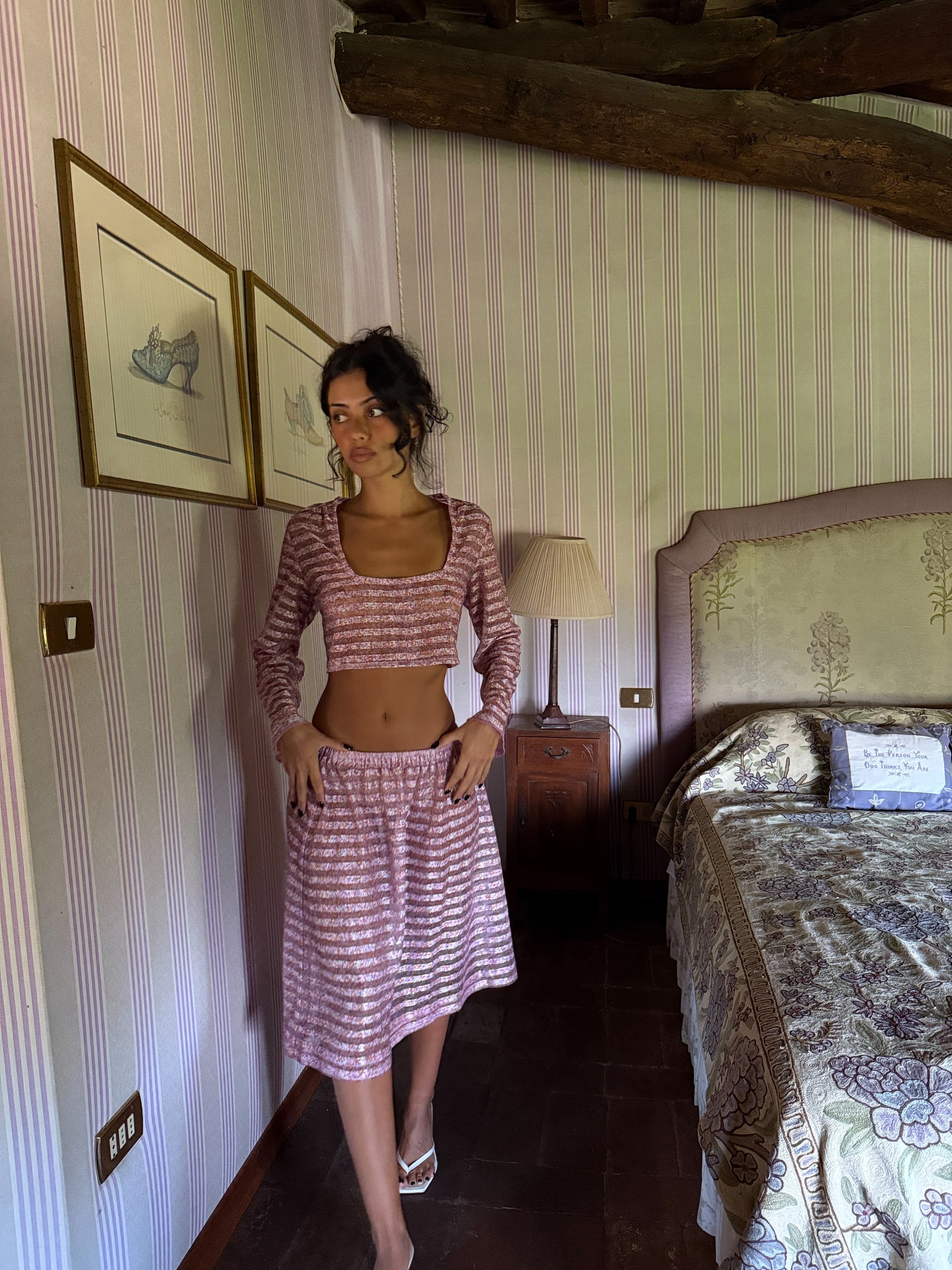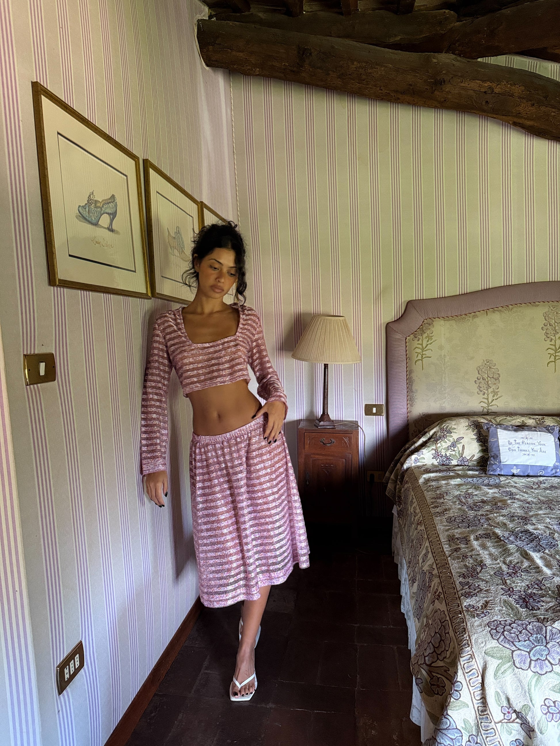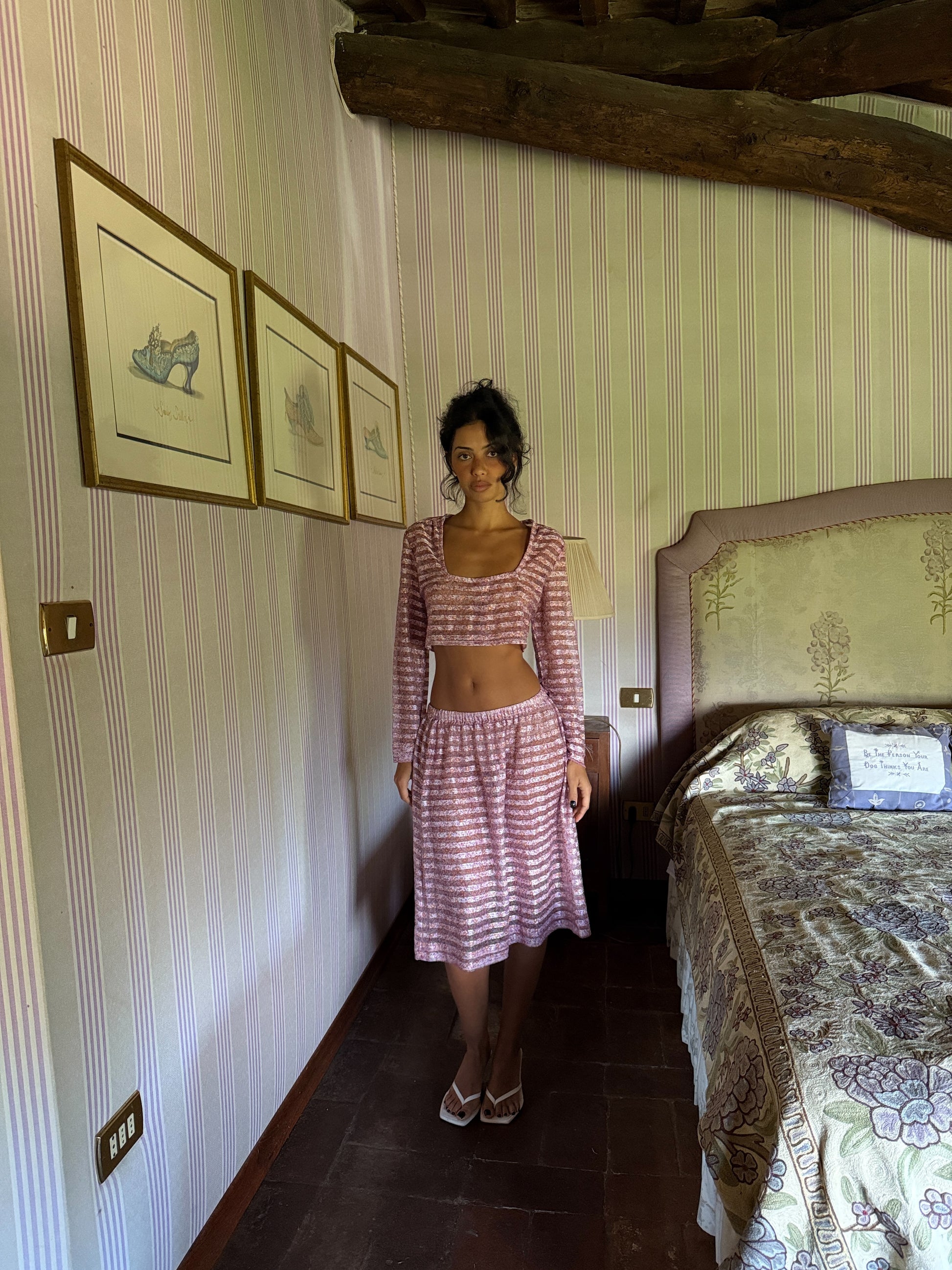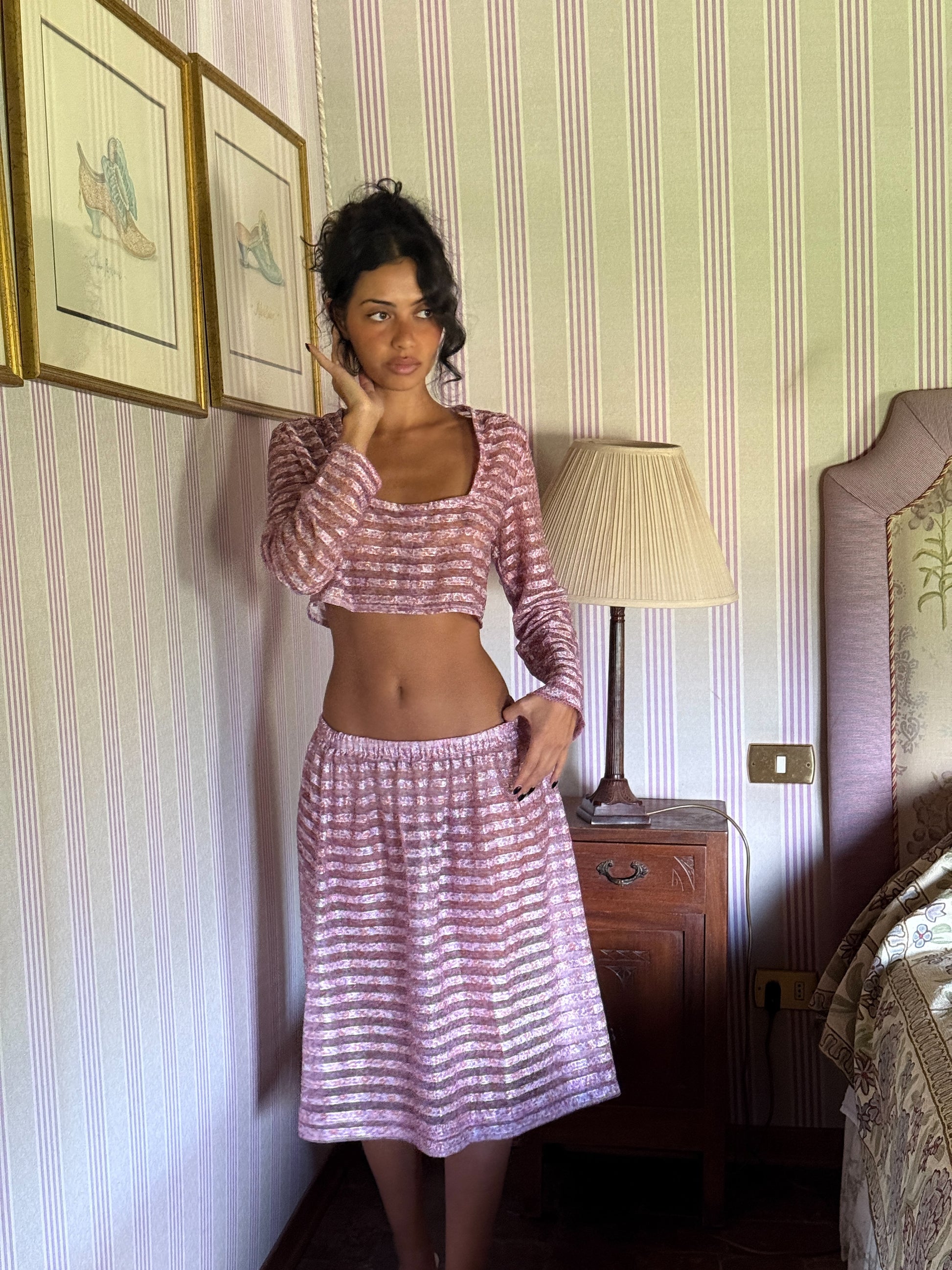 A vintage two-piece reimagined in dusky rose and faded lilac, whispering of sunlit balconies and old-world charm. The long-sleeve crop top hugs gently at the waist, with a soft square neckline for a romantic silhouette. Paired with a flowing midi skirt, the set moves effortlessly from barefoot mornings to candlelit dinners.