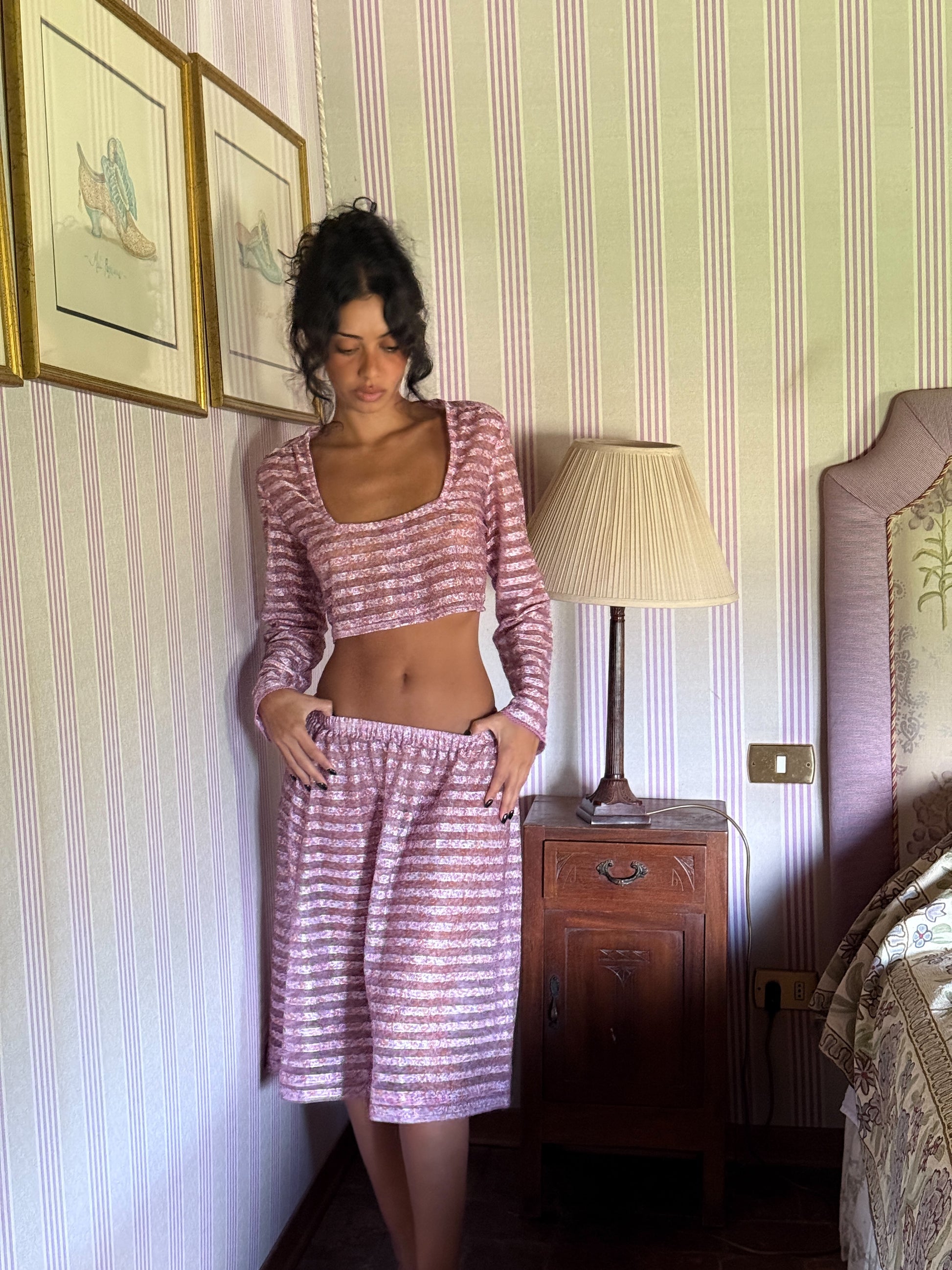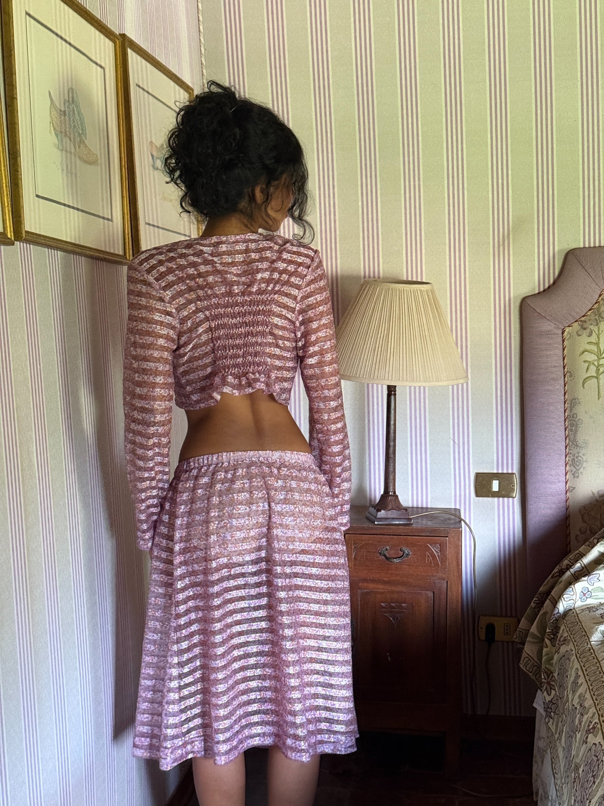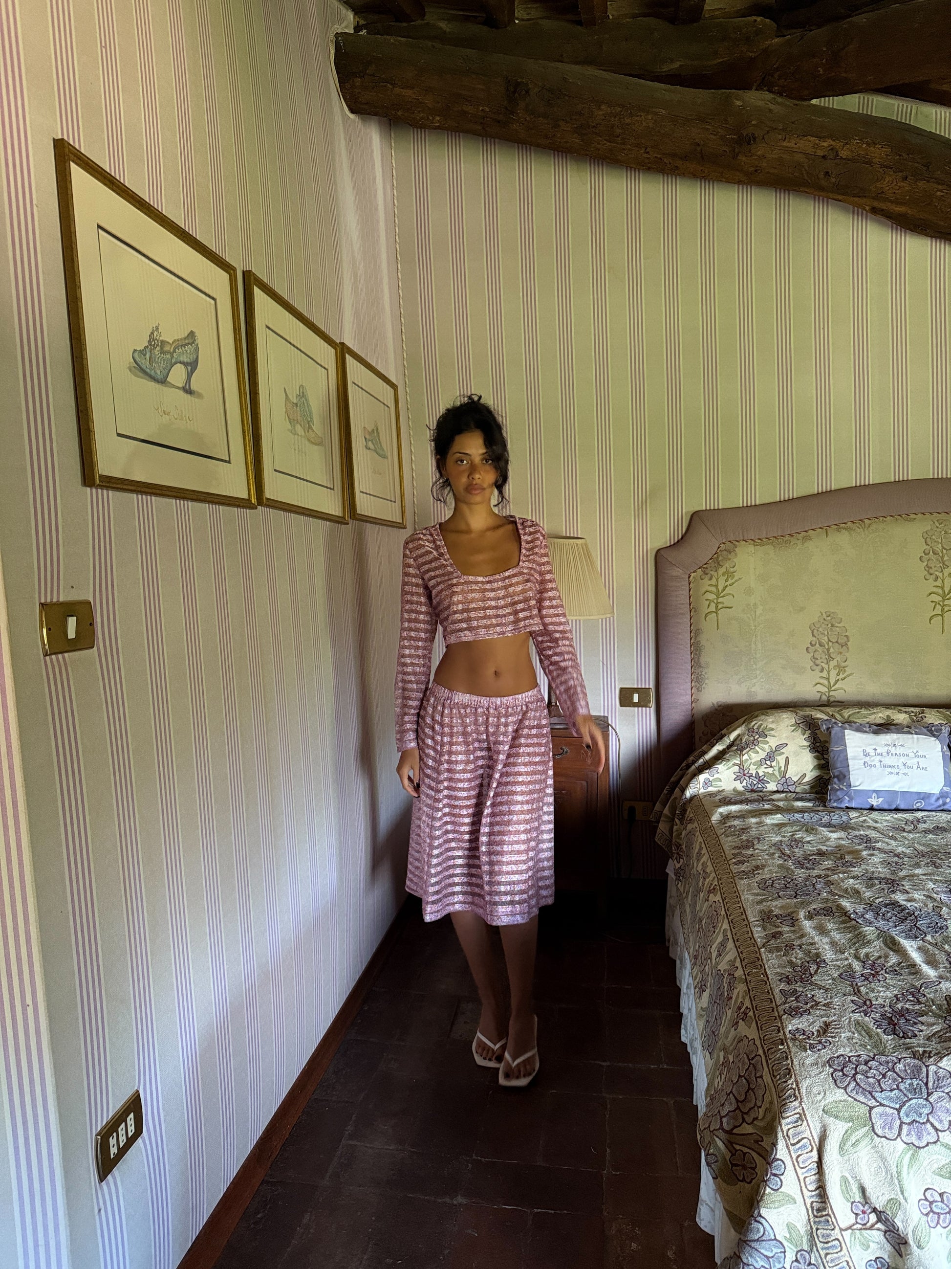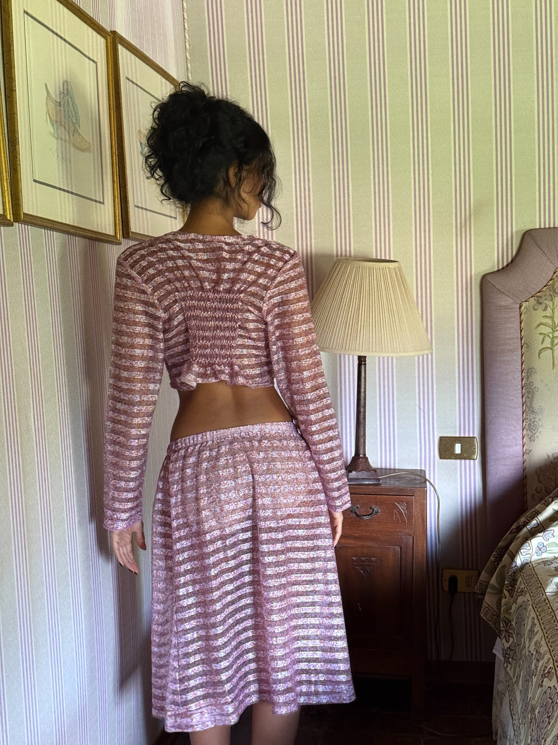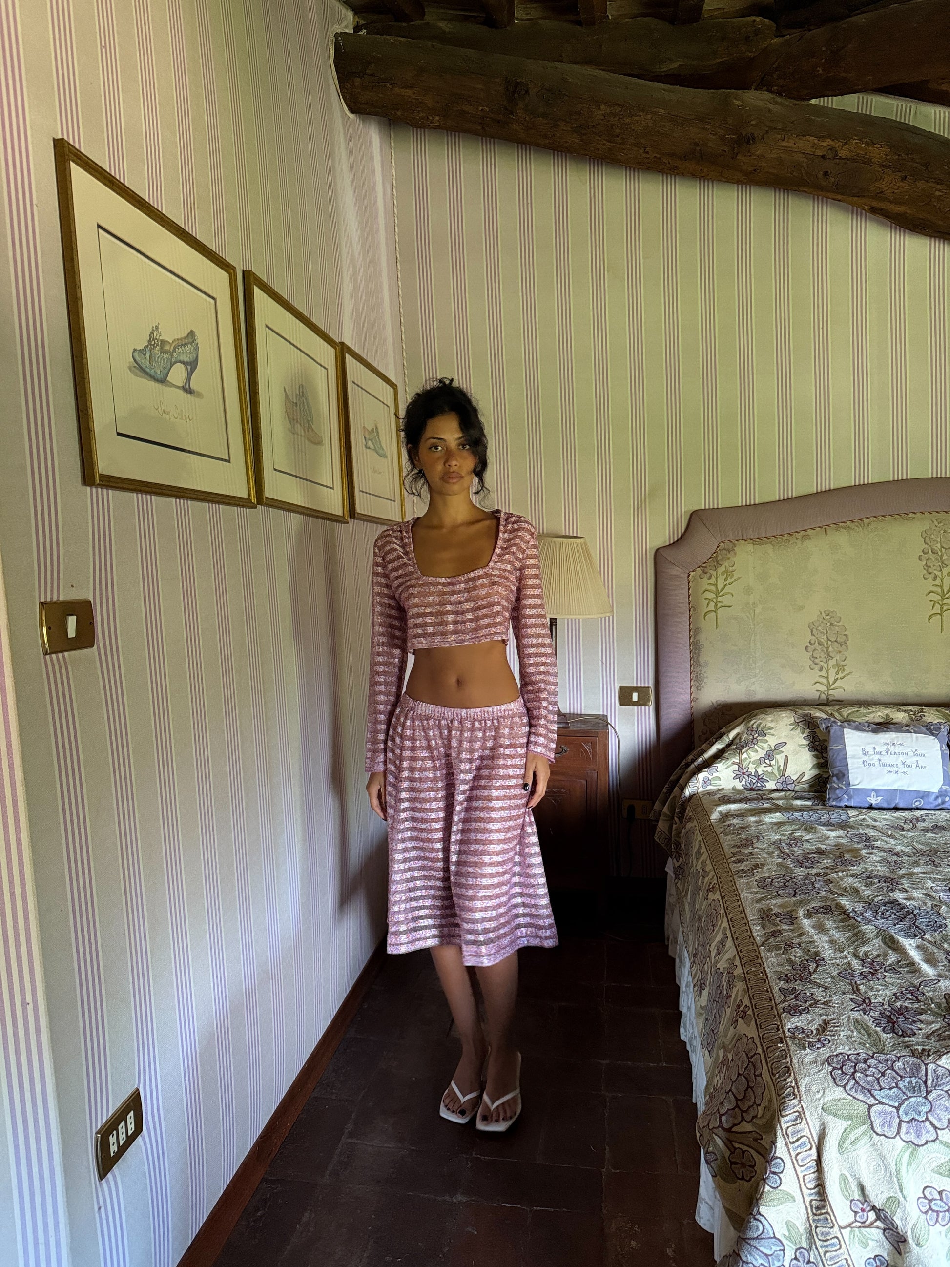 A vintage two-piece reimagined in dusky rose and faded lilac, whispering of sunlit balconies and old-world charm. The long-sleeve crop top hugs gently at the waist, with a soft square neckline for a romantic silhouette. Paired with a flowing midi skirt, the set moves effortlessly from barefoot mornings to candlelit dinners.